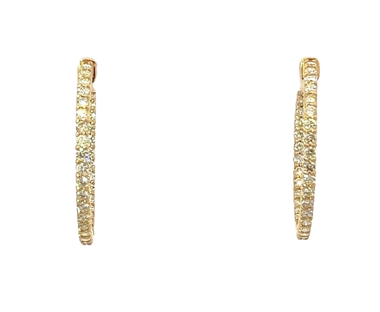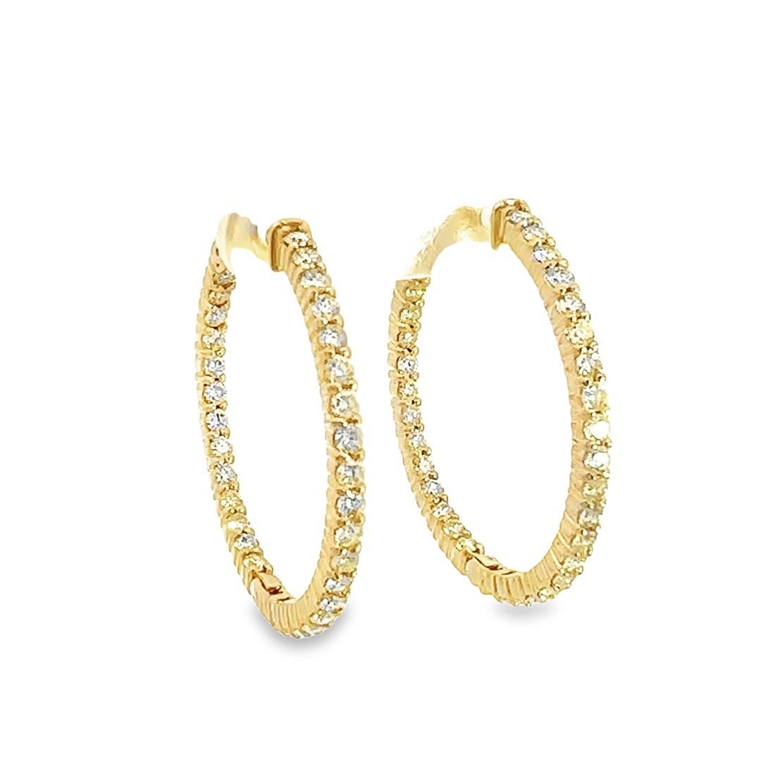 One pair electronically tested 14KT yellow gold lady's combination cast & assembled fashion inside-out hoop earrings with hinged, snap locking posts with a bright polish finish. The featured hoop earring has a diameter of 30.00 millimeter. Identified with markings of "14K". Condition is new, good workmanship. Containing: Sixty-Six prong set round brilliant cut diamonds, measuring 2.00 - 1.90 x 1.25mm (depth est.) approximate total weight of 66 Stones = 2.20ct. Graded in the setting. Graded in the setting. Color J - K Clarity VS-2 to SI-1 Cut Very Good Total Weight of Diamonds 2.20ct. Total Weight of Earrings 7.70gm Estimated Retail Value $ 7650.00