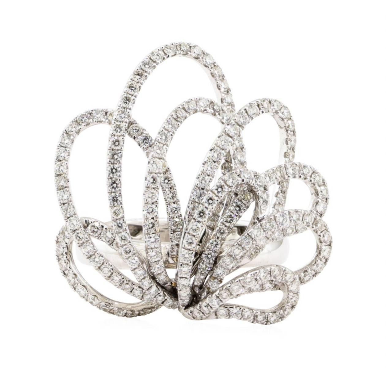 One electronically tested 14KT white gold lady's combination cast & assembled fashion ring with a reverse tapered shank with a bright polish finish. The featured lady's ring has nine interlocking loops and a shank measuring 4.30 millimeters wide. Identified with markings of '14K'. Condition is new, good workmanship. Containing: One Hundred Ninety-Nine prong set round brilliant cut diamonds, measuring 1.45 - 1.40 x 0.89mm (depth est.) approximate total weight of 199 Stones = 2.20ct. Graded in the setting. Color G - I Clarity VS-1 to SI-1 Cut Very Good. Total Weight of Diamonds 2.20ct.. Total Weight of Ring 9.00gm GAS Appraised at $8495.00. GAS Appraised.