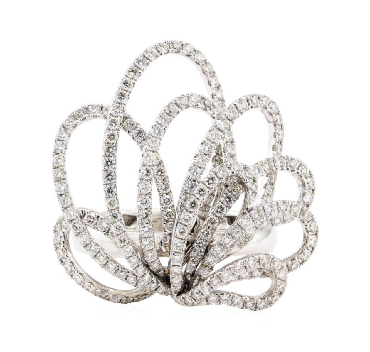 One electronically tested 14KT white gold lady's combination cast & assembled fashion ring with a reverse tapered shank with a bright polish finish. The featured lady's ring has nine interlocking loops and a shank measuring 4.30 millimeters wide. Identified with markings of '14K'. Condition is new, good workmanship. Containing: One Hundred Ninety-Nine prong set round brilliant cut diamonds, measuring 1.45 - 1.40 x 0.89mm (depth est.) approximate total weight of 199 Stones = 2.20 ct. Graded in the setting. Color G - I Clarity VS-1 to SI-1 Cut Very Good. Total Weight of Diamonds 2.20 ct.. Total Weight of Ring 9.00gm GAS Appraised at $8495.00. GAS Appraised.