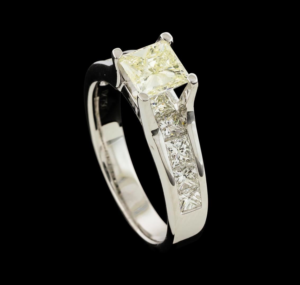 One electronically tested 18KT white gold lady's cast wedding ring with a cathedral shank with a bright polish finish. The featured lady's ring has a shank measuring 3.19 millimeters wide. Identified with markings of '18K 750'. Condition is new, good workmanship. Containing: One prong set princess cut diamond, measuring 5.69 x 5.55 x 3.85mm (depth est.) approximate weight of 1.00ct. Graded in the setting. Clarity SI-1. Color: K - L Cut Very Good Ten channel set princess cut diamonds, measuring 2.80 x 2.60 x 1.95mm (depth est.) approximate total weight of 10 Stones = 1.20ct. Graded in the setting. Clarity VS-2 to SI-1. Color: F - G Cut Very Good. Total Weight of Diamonds 2.20ct.. Total Weight of Ring 5.20gm. GAS Appraised at $14,560.00.
