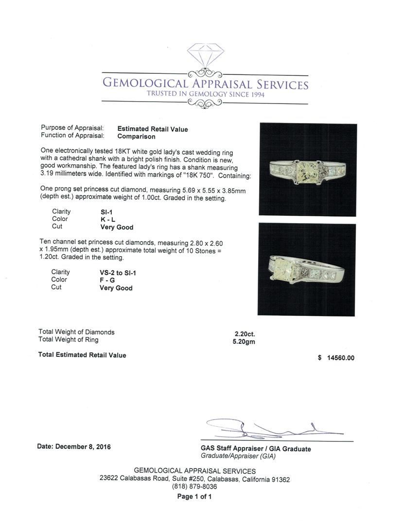 One electronically tested 18KT white gold lady's cast wedding ring with a cathedral shank with a bright polish finish. The featured lady's ring has a shank measuring 3.19 millimeters wide. Identified with markings of '18K 750'. Condition is new, good workmanship. Containing: One prong set princess cut diamond, measuring 5.69 x 5.55 x 3.85mm (depth est.) approximate weight of 1.00ct. Graded in the setting. Clarity SI-1. Color: K - L Cut Very Good Ten channel set princess cut diamonds, measuring 2.80 x 2.60 x 1.95mm (depth est.) approximate total weight of 10 Stones = 1.20ct. Graded in the setting. Clarity VS-2 to SI-1. Color: F - G Cut Very Good. Total Weight of Diamonds 2.20ct.. Total Weight of Ring 5.20gm. GAS Appraised at $14,560.00.