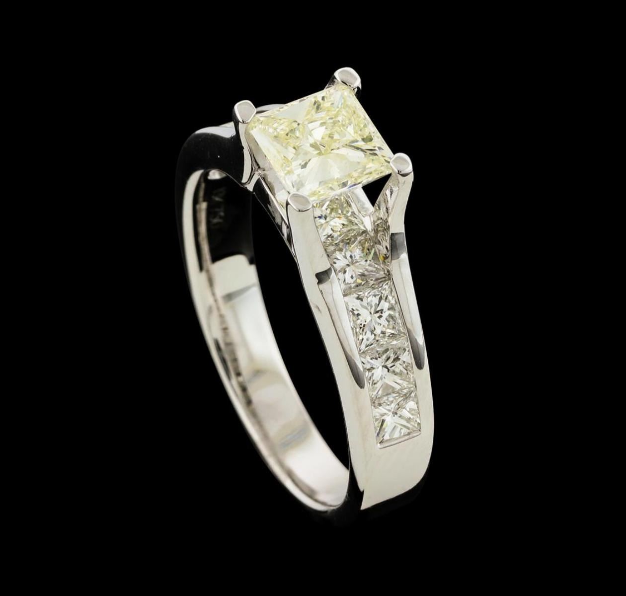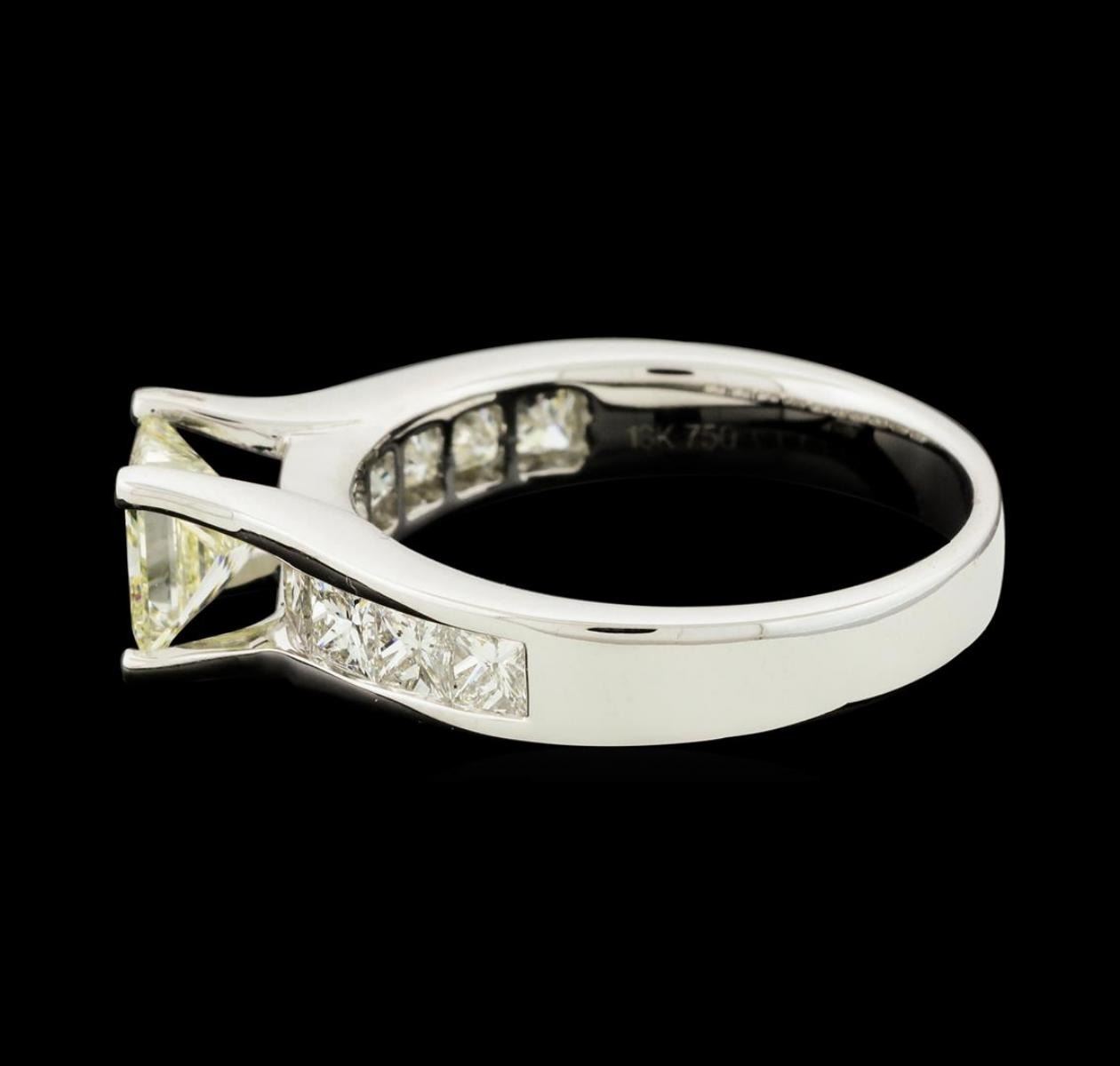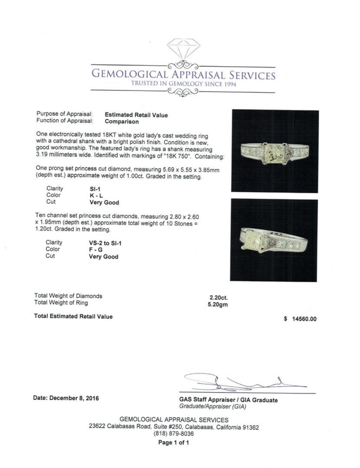 One electronically tested 18KT white gold lady's cast wedding ring with a cathedral shank with a bright polish finish. The featured lady's ring has a shank measuring 3.19 millimeters wide. Identified with markings of '18K 750'. Condition is new, good workmanship. Containing: One prong set princess cut diamond, measuring 5.69 x 5.55 x 3.85mm (depth est.) approximate weight of 1.00ct. Graded in the setting. Clarity SI-1. Color: K - L Cut Very Good Ten channel set princess cut diamonds, measuring 2.80 x 2.60 x 1.95mm (depth est.) approximate total weight of 10 Stones = 1.20ct. Graded in the setting. Clarity VS-2 to SI-1. Color: F - G Cut Very Good. Total Weight of Diamonds 2.20ct.. Total Weight of Ring 5.20gm. GAS Appraised.
