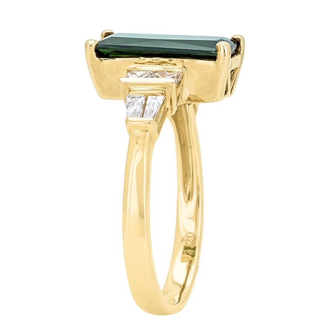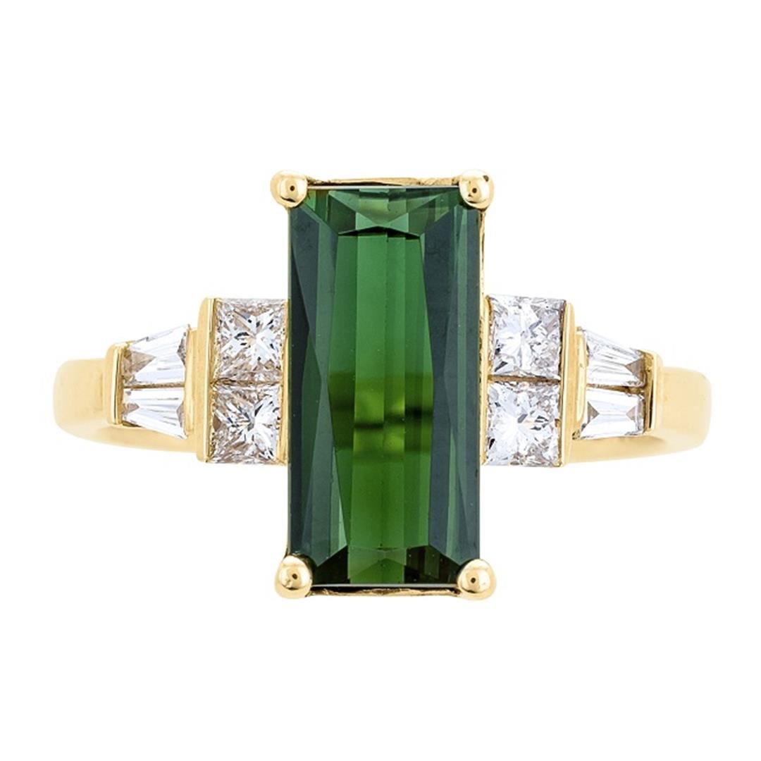 One Green Tourmaline and Diamond Ring featuring: 14KT Yellow Gold with a total weight of 2.89 grams, Green Tourmaline with a total weight of 2.20ct, 4 Princess Cut Diamonds with a total weight of 0.36ctw, and 4 Baguette Cut Diamonds with a total weight of 0.16ctw.