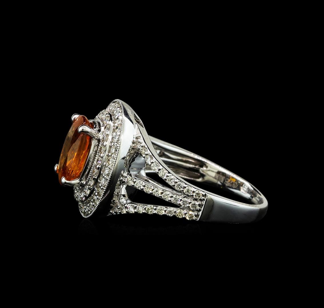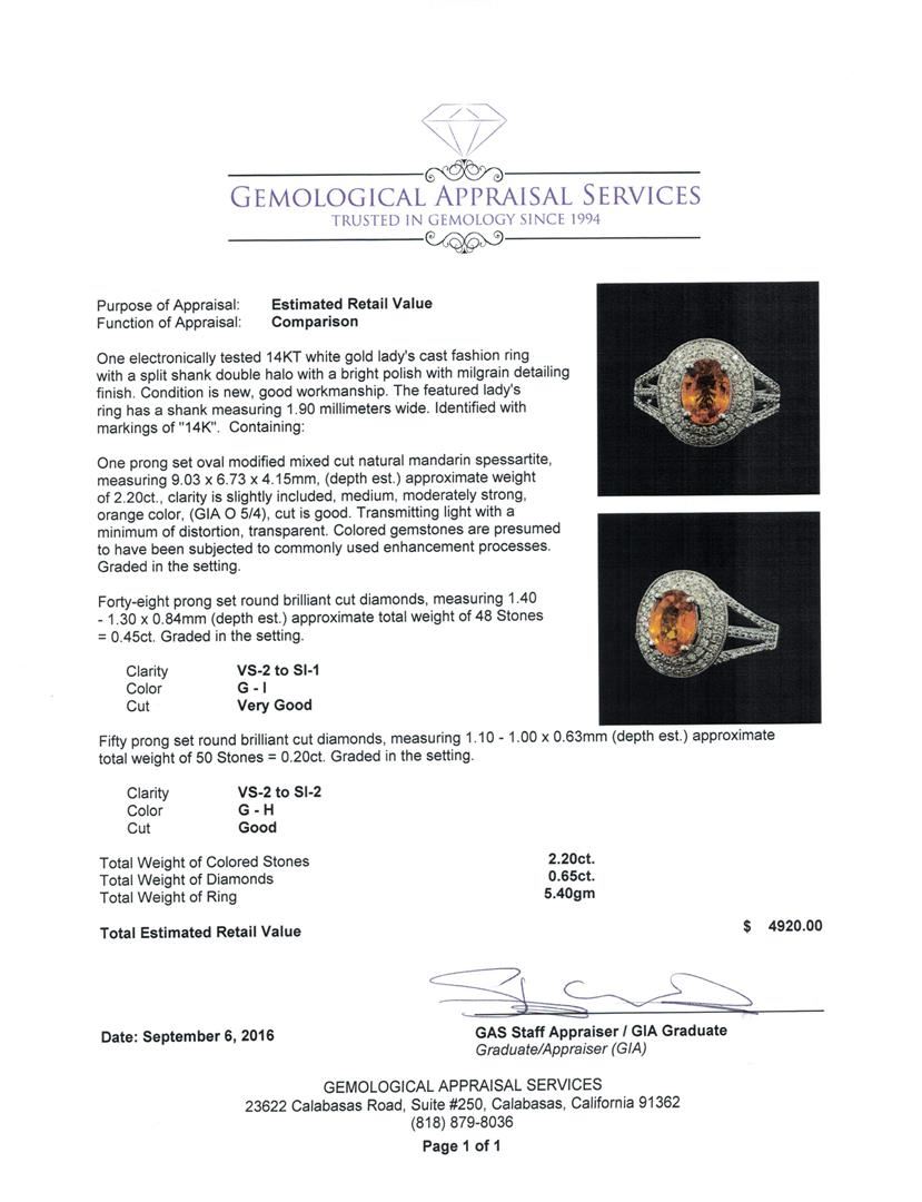 One electronically tested 14KT white gold lady's cast fashion ring with a split shank double halo with a bright polish with milgrain detailing finish. The featured lady's ring has a shank measuring 1.90 millimeters wide. Identified with markings of '14K'. Condition is new, good workmanship. Containing: One prong set oval modified mixed cut natural mandarin spessartite, measuring 9.03 x 6.73 x 4.15mm, (depth est.) approximate weight of 2.20ct., clarity is slightly included, medium, moderately strong, orange color, (GIA O 5/4), cut is good. Transmitting light with a minimum of distortion, transparent. Colored gemstones are presumed to have been subjected to commonly used enhancement processes. Graded in the setting. Forty-Eight prong set round brilliant cut diamonds, measuring 1.40 - 1.30 x 0.84mm (depth est.) approximate total weight of 48 Stones = 0.45ct. Graded in the setting. Clarity VS-2 to SI-1. Color: G - I Cut Very Good Fifty prong set round brilliant cut diamonds, measuring 1.10 - 1.00 x 0.63mm (depth est.) approximate total weight of 50 Stones = 0.20ct. Graded in the setting. Clarity VS-2 to SI-2. Color: G - H Cut Good. Total Weight of Colored Stones 2.20ct.. Total Weight of Diamonds 0.65ct.. Total Weight of Ring 5.40gm GAS Appraised at $4,920.00.