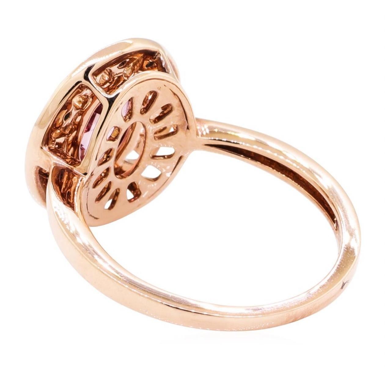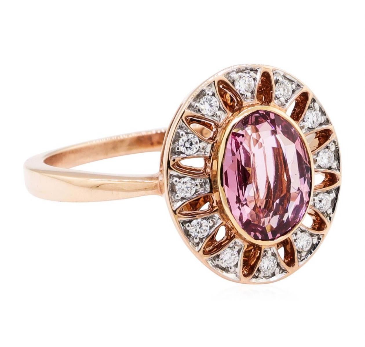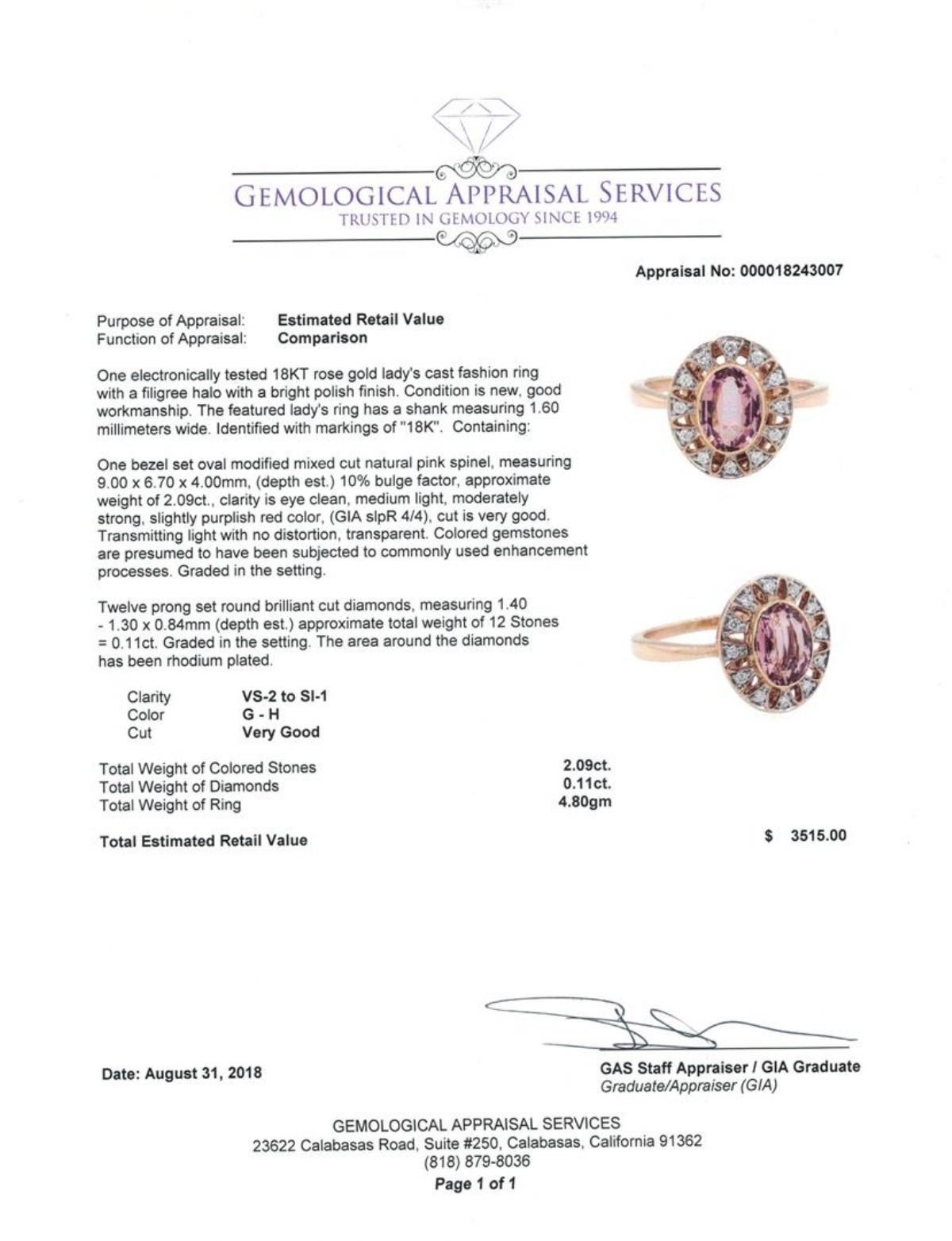 One electronically tested 18KT rose gold lady's cast fashion ring with a filigree halo with a bright polish finish. The featured lady's ring has a shank measuring 1.60 millimeters wide. Identified with markings of '18K'. Condition is new, good workmanship. Containing: One bezel set oval modified mixed cut natural pink spinel, measuring 9.00 x 6.70 x 4.00mm, (depth est.) 10%. bulge factor, approximate weight of 2.09ct., clarity is eye clean, medium light, moderately strong, slightly purplish red color, (GIA slpR 4/4), cut is very good. Transmitting light with no distortion, transparent. Colored gemstones are presumed to have been subjected to commonly used enhancement processes. Graded in the setting. Twelve prong set round brilliant cut diamonds, measuring 1.40 - 1.30 x 0.84mm (depth est.) approximate total weight of 12 Stones = 0.11ct. Graded in the setting. The area around the diamonds has been rhodium plated. Color G - H Clarity VS-2 to SI-1 Cut Very Good. Total Weight of Colored Stones 2.09ct.. Total Weight of Diamonds 0.11ct.. Total Weight of Ring 4.80gm GAS Appraised at $3515.00. GAS Appraised.