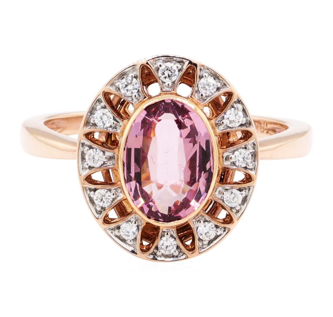 One electronically tested 18KT rose gold lady's cast fashion ring with a filigree halo with a bright polish finish. The featured lady's ring has a shank measuring 1.60 millimeters wide. Identified with markings of '18K'. Condition is new, good workmanship. Containing: One bezel set oval modified mixed cut natural pink spinel, measuring 9.00 x 6.70 x 4.00mm, (depth est.) 10%. bulge factor, approximate weight of 2.09ct., clarity is eye clean, medium light, moderately strong, slightly purplish red color, (GIA slpR 4/4), cut is very good. Transmitting light with no distortion, transparent. Colored gemstones are presumed to have been subjected to commonly used enhancement processes. Graded in the setting. Twelve prong set round brilliant cut diamonds, measuring 1.40 - 1.30 x 0.84mm (depth est.) approximate total weight of 12 Stones = 0.11ct. Graded in the setting. The area around the diamonds has been rhodium plated. Color G - H Clarity VS-2 to SI-1 Cut Very Good. Total Weight of Colored Stones 2.09ct.. Total Weight of Diamonds 0.11ct.. Total Weight of Ring 4.80gm GAS Appraised at $3515.00. GAS Appraised.