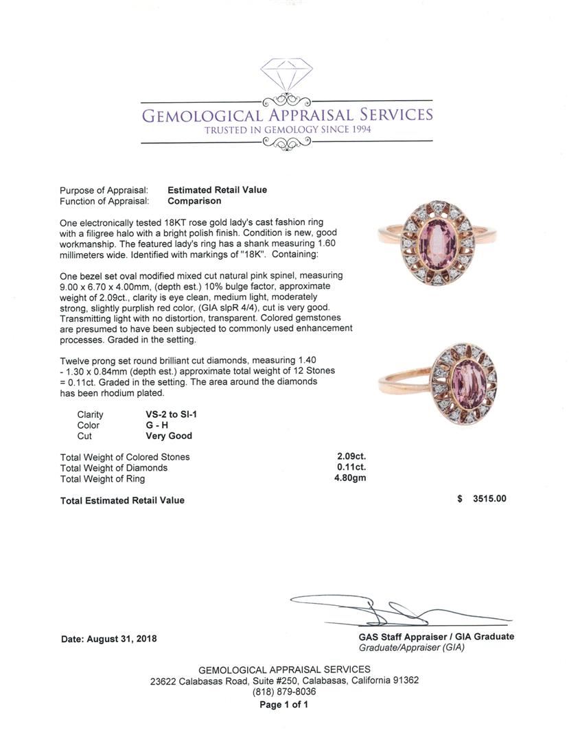 One electronically tested 18KT rose gold lady's cast fashion ring with a filigree halo with a bright polish finish. The featured lady's ring has a shank measuring 1.60 millimeters wide. Identified with markings of '18K'. Condition is new, good workmanship. Containing: One bezel set oval modified mixed cut natural pink spinel, measuring 9.00 x 6.70 x 4.00mm, (depth est.) 10%. bulge factor, approximate weight of 2.09ct., clarity is eye clean, medium light, moderately strong, slightly purplish red color, (GIA slpR 4/4), cut is very good. Transmitting light with no distortion, transparent. Colored gemstones are presumed to have been subjected to commonly used enhancement processes. Graded in the setting. Twelve prong set round brilliant cut diamonds, measuring 1.40 - 1.30 x 0.84mm (depth est.) approximate total weight of 12 Stones = 0.11ct. Graded in the setting. The area around the diamonds has been rhodium plated. Color G - H Clarity VS-2 to SI-1 Cut Very Good. Total Weight of Colored Stones 2.09ct.. Total Weight of Diamonds 0.11ct.. Total Weight of Ring 4.80gm GAS Appraised at $3515.00. GAS Appraised at $3,515.00.