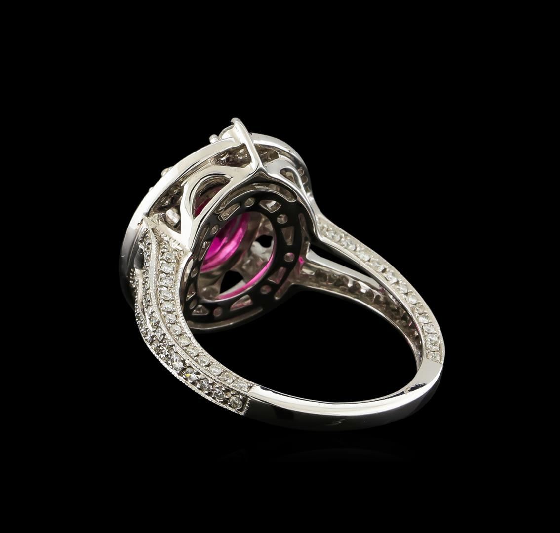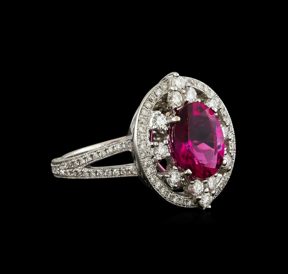 One electronically tested 18KT white gold lady's cast fashion ring with a split shank basket halo with a bright polish with milgrain detailing finish. The featured lady's ring has a shank measuring 2.07 millimeters wide. Identified with markings of "750". Condition is new, good workmanship. Containing: One prong set oval modified brilliant cut natural rubellite, measuring 9.88 x 7.86 x 4.79mm, approximate weight of 2.20ct., clarity is slightly included, type III, medium dark, moderately strong, strongly purplish red color, (GIA stpR 6/4), cut is very good. Transmitting light with a minimum of distortion, transparent. Colored gemstones are presumed to have been subjected to commonly used enhancement processes. Graded in the setting. Twelve prong set round brilliant cut diamonds, measuring 2.10 - 2.00 x 1.27mm (depth est.) approximate total weight of 12 Stones = 0.39ct. Graded in the setting. Clarity: SI-1 to SI-2. Color: G - Good One Hundred Forty prong set round brilliant cut diamonds, measuring 1.20 - 1.10 x 0.71mm (depth est.) approximate total weight of 140 Stones = 0.85ct. Graded in the setting. Clarity: SI-1 to SI-2. Color: G - Good. Total Weight of Colored Stones 2.20ct. Total Weight of Diamonds 1.24ct. Total Weight of Ring 7.10gm GAS Appraised at $7,305.00.