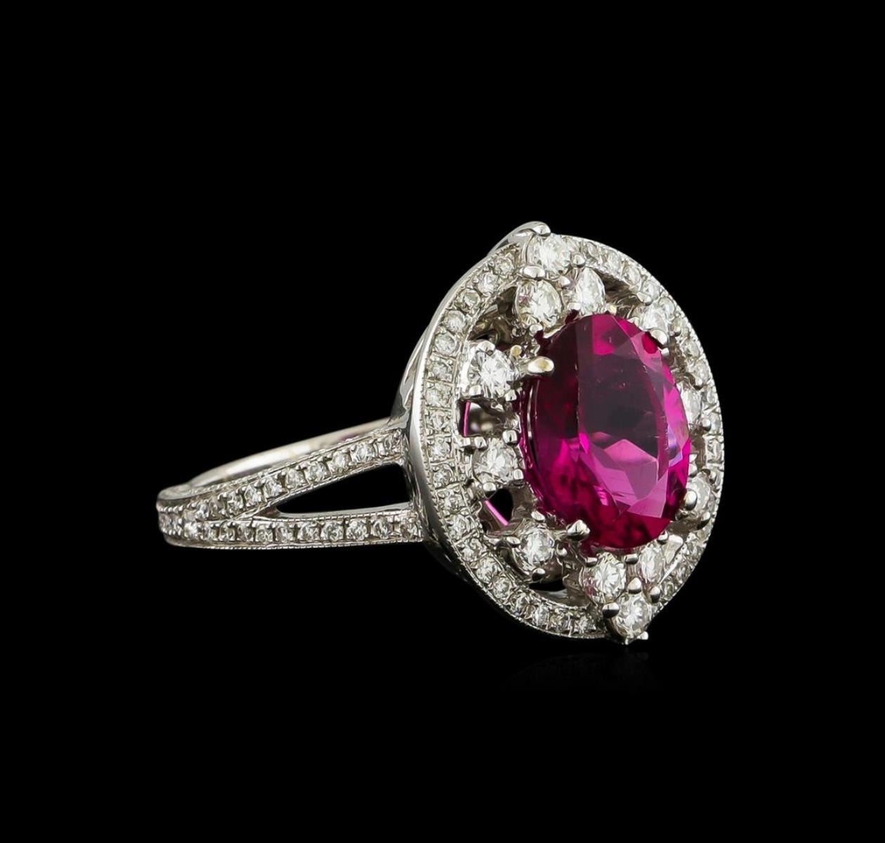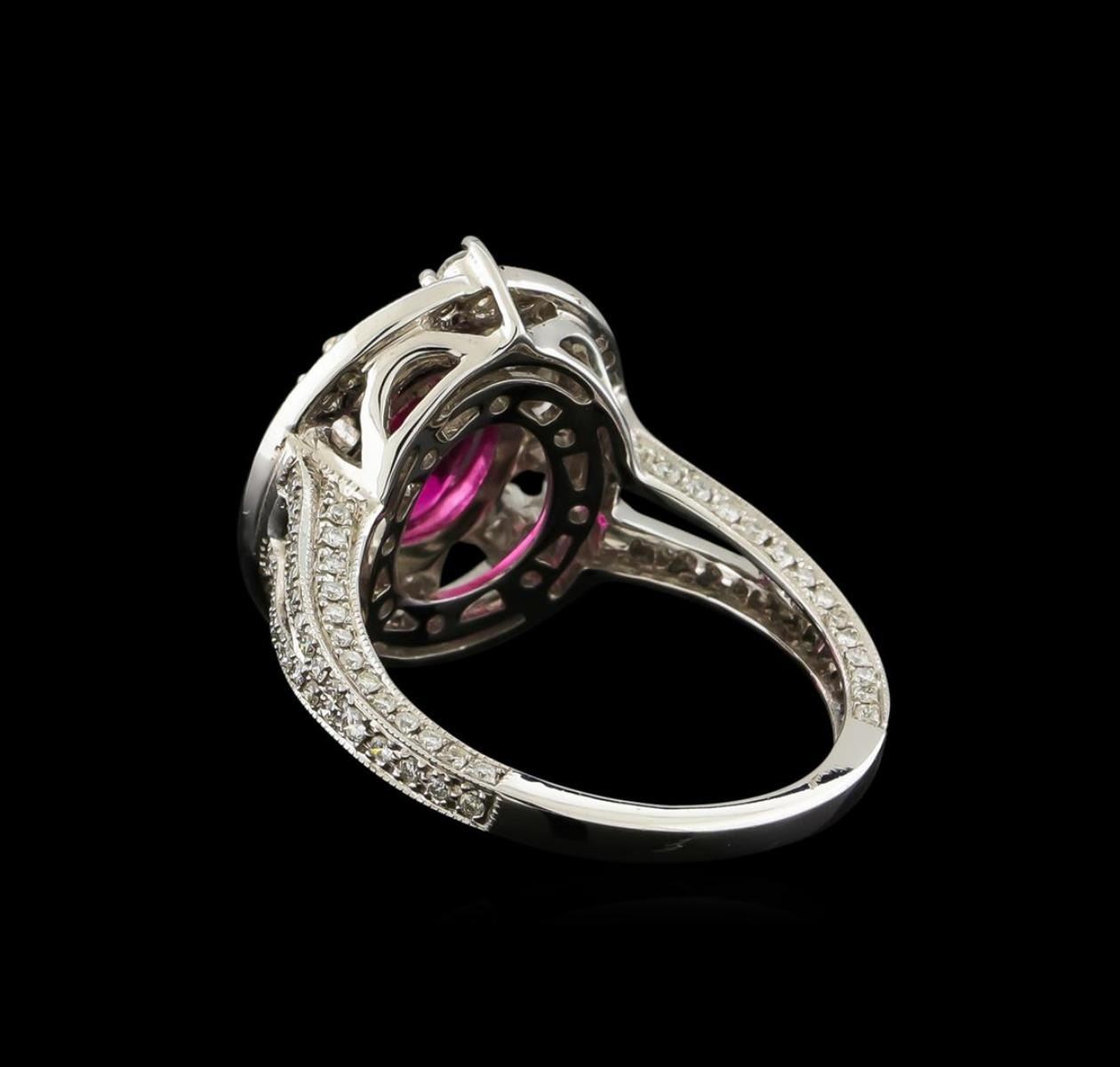 One electronically tested 18KT white gold lady's cast fashion ring with a split shank basket halo with a bright polish with milgrain detailing finish. The featured lady's ring has a shank measuring 2.07 millimeters wide. Identified with markings of "750". Condition is new, good workmanship. Containing: One prong set oval modified brilliant cut natural rubellite, measuring 9.88 x 7.86 x 4.79mm, approximate weight of 2.20ct., clarity is slightly included, type III, medium dark, moderately strong, strongly purplish red color, (GIA stpR 6/4), cut is very good. Transmitting light with a minimum of distortion, transparent. Colored gemstones are presumed to have been subjected to commonly used enhancement processes. Graded in the setting. Twelve prong set round brilliant cut diamonds, measuring 2.10 - 2.00 x 1.27mm (depth est.) approximate total weight of 12 Stones = 0.39ct. Graded in the setting. Clarity: SI-1 to SI-2. Color: G -  Good One Hundred Forty prong set round brilliant cut diamonds, measuring 1.20 - 1.10 x 0.71mm (depth est.) approximate total weight of 140 Stones = 0.85ct. Graded in the setting. Clarity: SI-1 to SI-2. Color: G -  Good. Total Weight of Colored Stones 2.20ct. Total Weight of Diamonds 1.24ct. Total Weight of Ring 7.10gm GAS Appraised.
