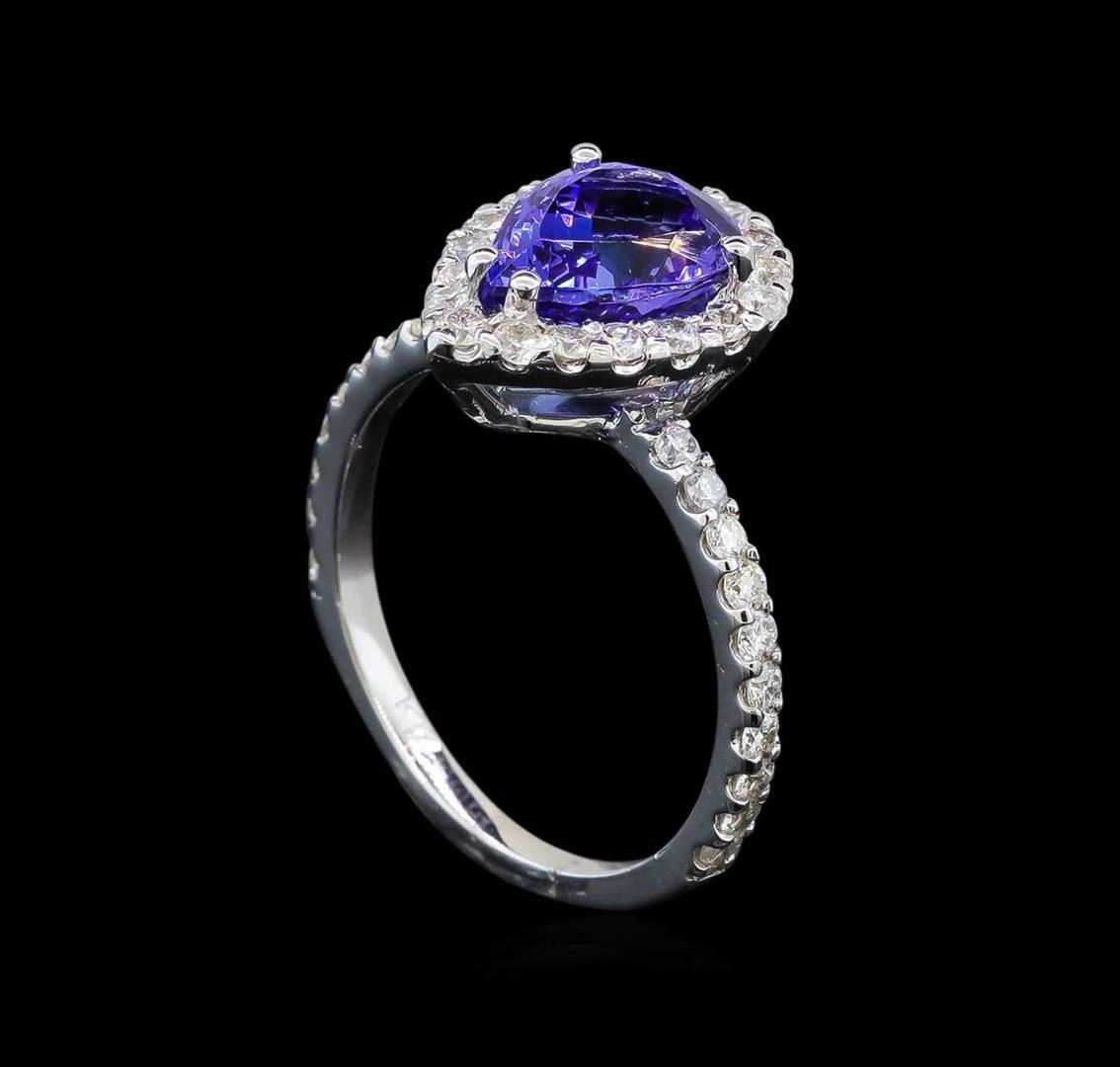One electronically tested 14KT white gold lady's cast fashion ring with a basket halo with a bright polish finish. The featured lady's ring has a shank measuring 1.74 millimeters wide. Identified with markings of 'K14'. Condition is new, good workmanship. Containing: One prong set pear modified brilliant cut natural tanzanite, measuring 9.50 x 7.30 x 5.17mm, (depth est.) approximate weight of 2.20ct., clarity is eye clean, medium dark, moderately strong, violetish blue color, (GIA vB 6/4), cut is very good. Transmitting light with no distortion, transparent. Colored gemstones are presumed to have been subjected to commonly used enhancement processes. Graded in the setting. Eighteen prong set round brilliant cut diamonds, measuring 1.90 - 1.80 x 1.11mm (depth est.) approximate total weight of 18 Stones = 0.42ct. Graded in the setting. Clarity SI-1 to SI-2. Color: H - I Cut Good Twenty prong set round brilliant cut diamonds, measuring 1.75 - 1.65 x 1.05mm (depth est.) approximate total weight of 20 Stones = 0.38ct. Graded in the setting. Clarity SI-1 to I-1. Color: H - I Cut Good. Total Weight of Colored Stones 2.20ct.. Total Weight of Diamonds 0.80ct.. Total Weight of Ring 3.50gm. GAS Appraised at $5,840.00.