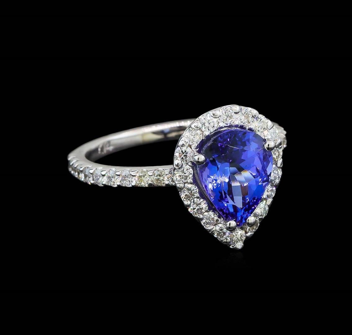 One electronically tested 14KT white gold lady's cast fashion ring with a basket halo with a bright polish finish. The featured lady's ring has a shank measuring 1.74 millimeters wide. Identified with markings of 'K14'. Condition is new, good workmanship. Containing: One prong set pear modified brilliant cut natural tanzanite, measuring 9.50 x 7.30 x 5.17mm, (depth est.) approximate weight of 2.20ct., clarity is eye clean, medium dark, moderately strong, violetish blue color, (GIA vB 6/4), cut is very good. Transmitting light with no distortion, transparent. Colored gemstones are presumed to have been subjected to commonly used enhancement processes. Graded in the setting. Eighteen prong set round brilliant cut diamonds, measuring 1.90 - 1.80 x 1.11mm (depth est.) approximate total weight of 18 Stones = 0.42ct. Graded in the setting. Clarity SI-1 to SI-2. Color: H - I Cut Good Twenty prong set round brilliant cut diamonds, measuring 1.75 - 1.65 x 1.05mm (depth est.) approximate total weight of 20 Stones = 0.38ct. Graded in the setting. Clarity SI-1 to I-1. Color: H - I Cut Good. Total Weight of Colored Stones 2.20ct.. Total Weight of Diamonds 0.80ct.. Total Weight of Ring 3.50gm.