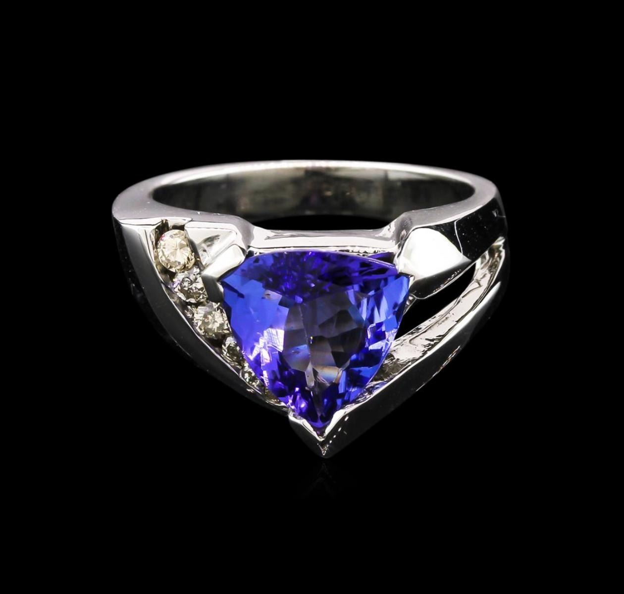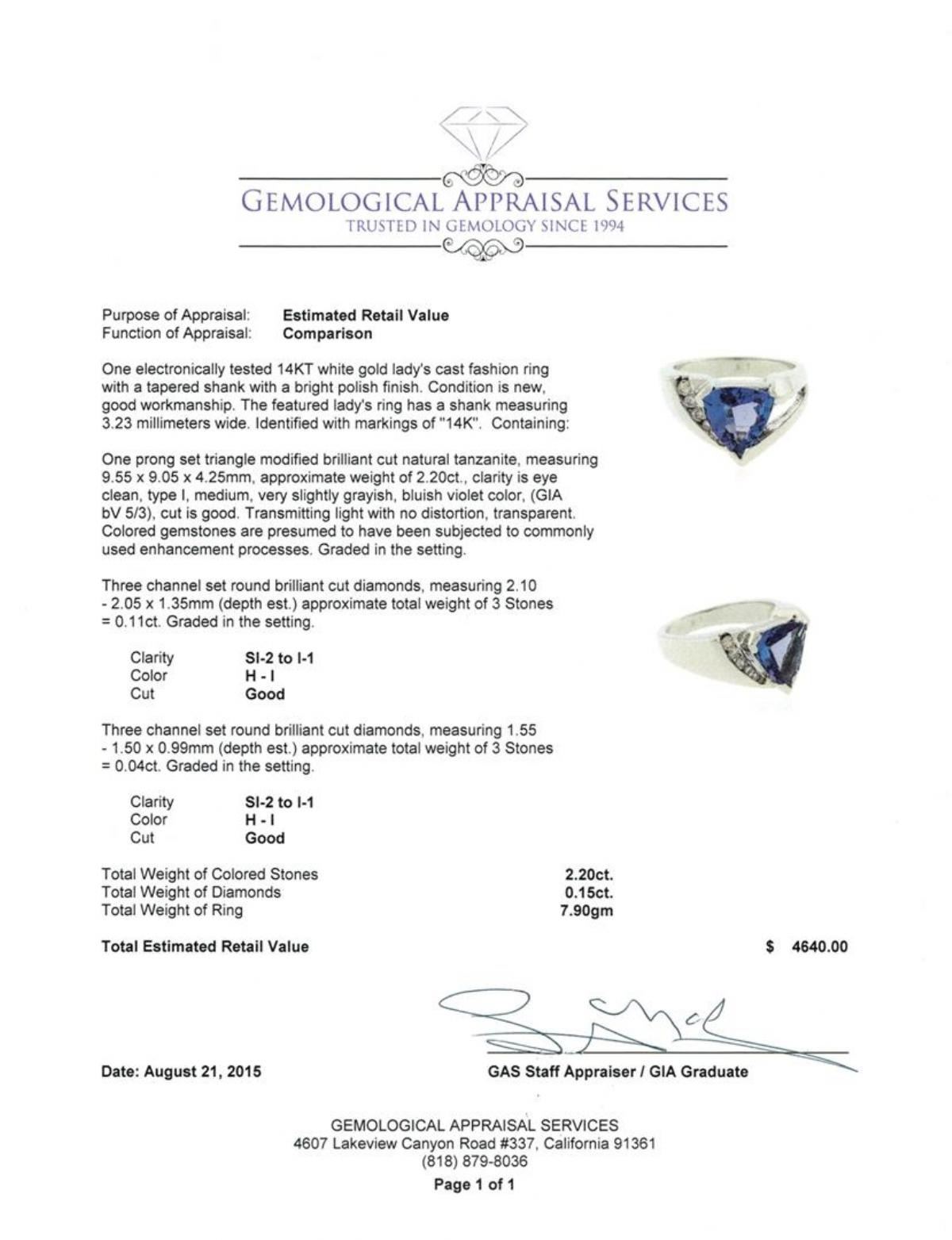 One electronically tested 14KT white gold lady's cast fashion ring with a tapered shank with a bright polish finish. The featured lady's ring has a shank measuring 3.23 millimeters wide. Identified with markings of "14K". Condition is new, good workmanship. Containing: One prong set triangle modified brilliant cut natural tanzanite, measuring 9.55 x 9.05 x 4.25mm, approximate weight of 2.20 ct., clarity is eye clean, type I, medium, very slightly grayish, bluish violet color, (GIA bV 5/3), cut is good. Transmitting light with no distortion, transparent. Colored gemstones are presumed to have been subjected to commonly used enhancement processes. Graded in the setting. Three channel set round brilliant cut diamonds, measuring 2.10 - 2.05 x 1.35mm (depth est.) approximate total weight of 3 Stones = 0.11ct. Graded in the setting. Clarity: SI-2 to I-1. Color: H - I. Cut Good Three channel set round brilliant cut diamonds, measuring 1.55 - 1.50 x 0.99mm (depth est.) approximate total weight of 3 Stones = 0.04ct. Graded in the setting. Clarity: SI-2 to I-1. Color: H - I. Cut Good. Total Weight of Colored Stones 2.20 ct. Total Weight of Diamonds 0.15ct. Total Weight of Ring 7.90gm. GAS Appraised.