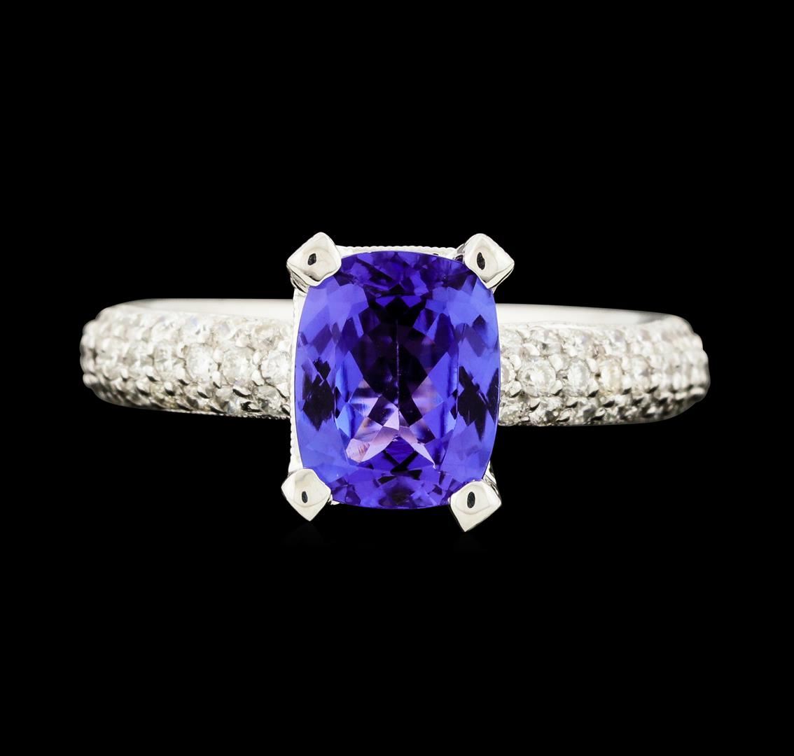 One electronically tested 18KT white gold lady's cast fashion ring with a basket setting with a bright polish with milgrain detailing finish. The featured lady's ring has a half dome, diamond encrusted shank measuring 3.45 millimeters wide. Identified with markings of '18K 750'. Condition is new, good workmanship. Containing: One prong set rectangular cushion modified brilliant cut natural tanzanite, measuring 8.95 x 7.12 x 4.02mm, (depth est.) 10%. bulge factor, approximate weight of 2.20ct., clarity is eye clean, medium, moderately strong, violetish blue color, (GIA vB 5/4), cut is very good. Transmitting light with no distortion, transparent. Colored gemstones are presumed to have been subjected to commonly used enhancement processes. Graded in the setting. Ninety-Two prong set round brilliant cut diamonds, measuring 1.40 - 1.35 x 0.86mm (depth est.) approximate total weight of 92 Stones = 0.92ct. Graded in the setting. Clarity SI-1 to SI-2. Color: G - H Cut Good Thirty-Two prong set round brilliant cut diamonds, measuring 1.25 - 1.15 x 0.74mm (depth est.) approximate total weight of 32 Stones = 0.21ct. Graded in the setting. Clarity VS-2 to SI-1. Color: G - H Cut Good. Total Weight of Colored Stones 2.20ct.. Total Weight of Diamonds 1.13ct.. Total Weight of Ring 5.90gm. GAS Appraised at $5,935.00.