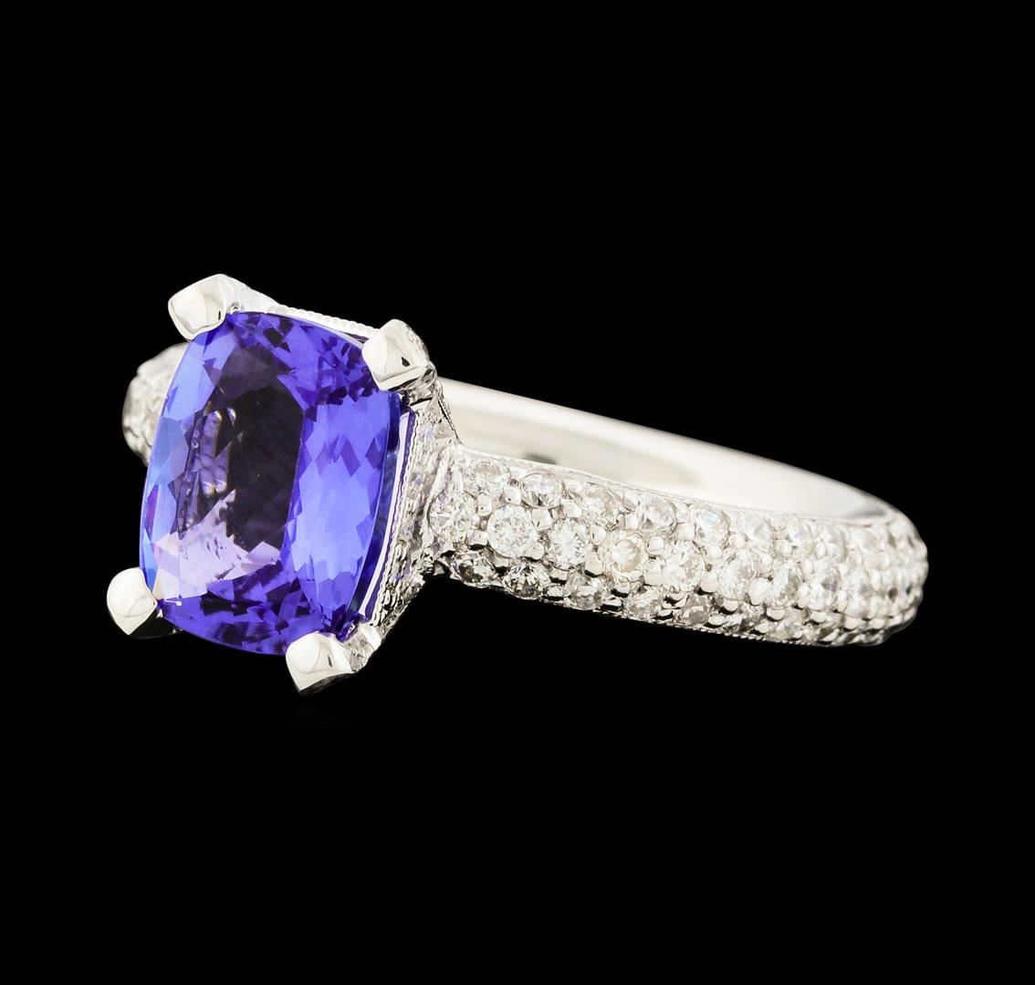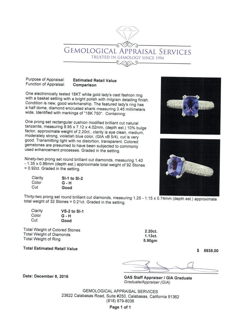 One electronically tested 18KT white gold lady's cast fashion ring with a basket setting with a bright polish with milgrain detailing finish. The featured lady's ring has a half dome, diamond encrusted shank measuring 3.45 millimeters wide. Identified with markings of '18K 750'. Condition is new, good workmanship. Containing: One prong set rectangular cushion modified brilliant cut natural tanzanite, measuring 8.95 x 7.12 x 4.02mm, (depth est.) 10%. bulge factor, approximate weight of 2.20ct., clarity is eye clean, medium, moderately strong, violetish blue color, (GIA vB 5/4), cut is very good. Transmitting light with no distortion, transparent. Colored gemstones are presumed to have been subjected to commonly used enhancement processes. Graded in the setting. Ninety-Two prong set round brilliant cut diamonds, measuring 1.40 - 1.35 x 0.86mm (depth est.) approximate total weight of 92 Stones = 0.92ct. Graded in the setting. Clarity SI-1 to SI-2. Color: G - H Cut Good Thirty-Two prong set round brilliant cut diamonds, measuring 1.25 - 1.15 x 0.74mm (depth est.) approximate total weight of 32 Stones = 0.21ct. Graded in the setting. Clarity VS-2 to SI-1. Color: G - H Cut Good. Total Weight of Colored Stones 2.20ct.. Total Weight of Diamonds 1.13ct.. Total Weight of Ring 5.90gm. GAS Appraised at $5,935.00.
