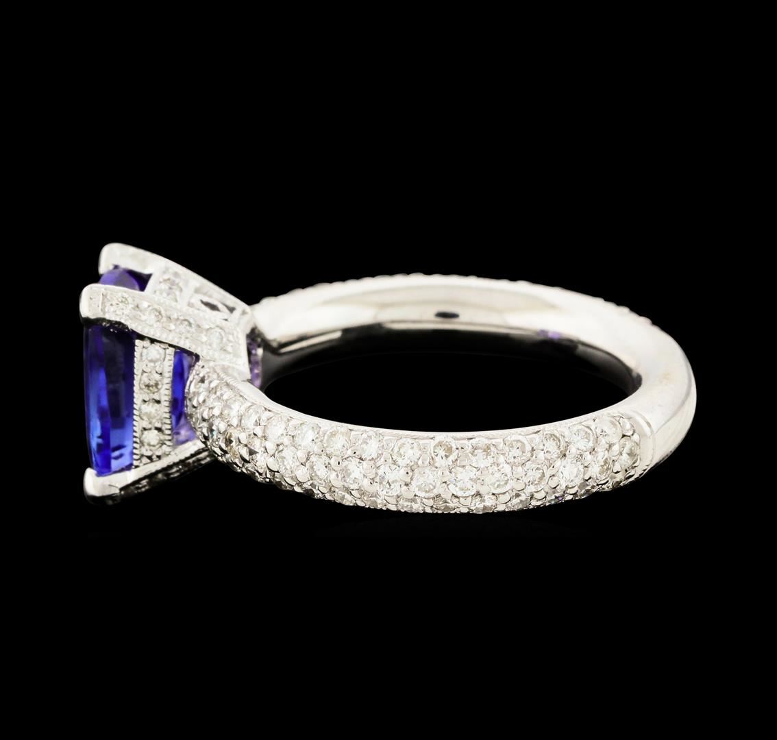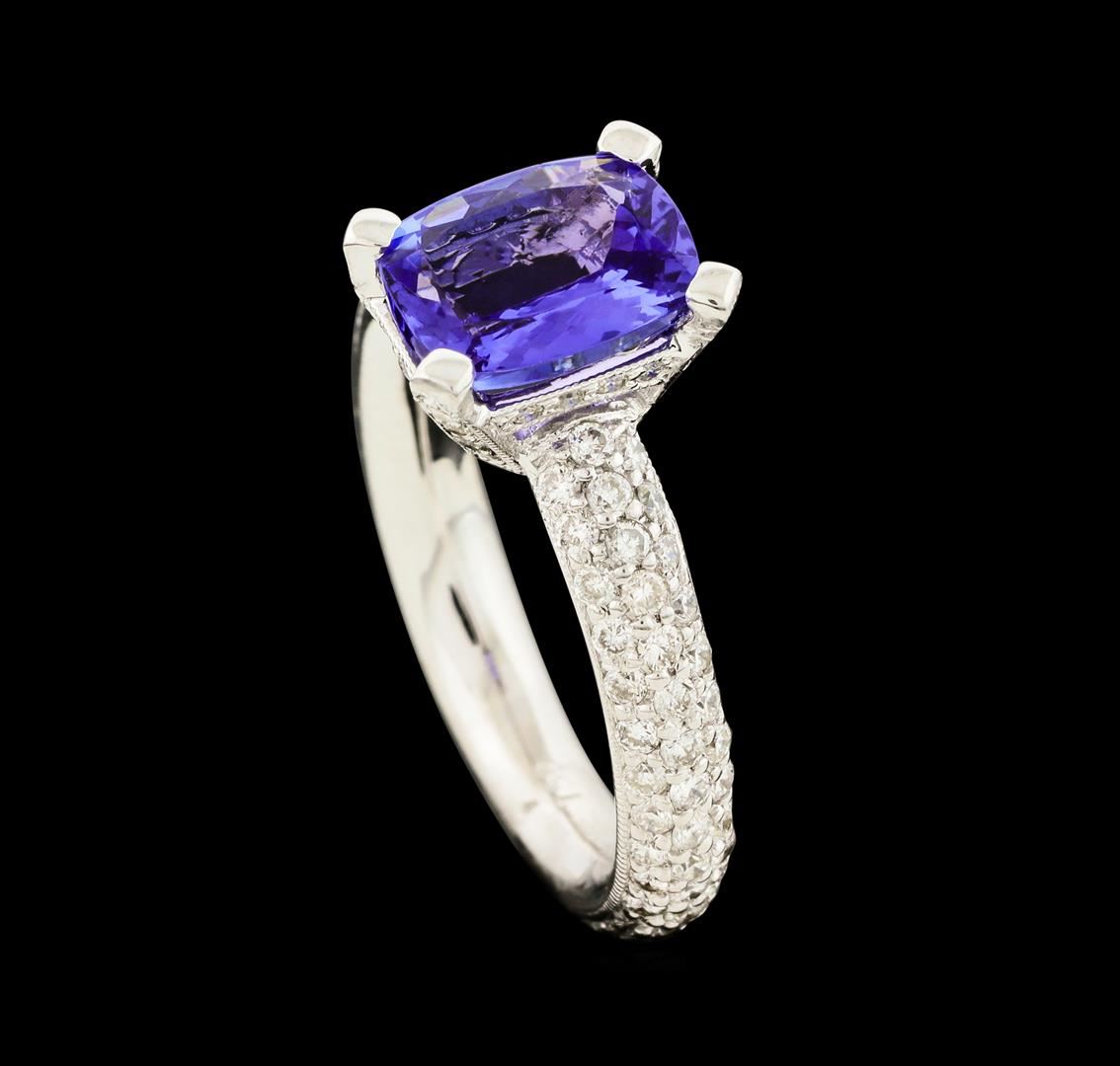 One electronically tested 18KT white gold lady's cast fashion ring with a basket setting with a bright polish with milgrain detailing finish. The featured lady's ring has a half dome, diamond encrusted shank measuring 3.45 millimeters wide. Identified with markings of '18K 750'. Condition is new, good workmanship. Containing: One prong set rectangular cushion modified brilliant cut natural tanzanite, measuring 8.95 x 7.12 x 4.02mm, (depth est.) 10%. bulge factor, approximate weight of 2.20ct., clarity is eye clean, medium, moderately strong, violetish blue color, (GIA vB 5/4), cut is very good. Transmitting light with no distortion, transparent. Colored gemstones are presumed to have been subjected to commonly used enhancement processes. Graded in the setting. Ninety-Two prong set round brilliant cut diamonds, measuring 1.40 - 1.35 x 0.86mm (depth est.) approximate total weight of 92 Stones = 0.92ct. Graded in the setting. Clarity SI-1 to SI-2. Color: G - H Cut Good Thirty-Two prong set round brilliant cut diamonds, measuring 1.25 - 1.15 x 0.74mm (depth est.) approximate total weight of 32 Stones = 0.21ct. Graded in the setting. Clarity VS-2 to SI-1. Color: G - H Cut Good. Total Weight of Colored Stones 2.20ct.. Total Weight of Diamonds 1.13ct.. Total Weight of Ring 5.90gm. GAS Appraised at $5,935.00.