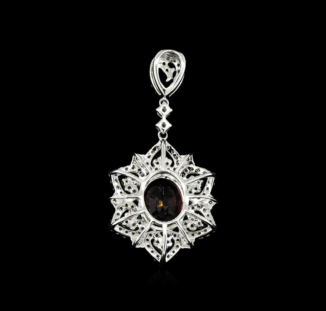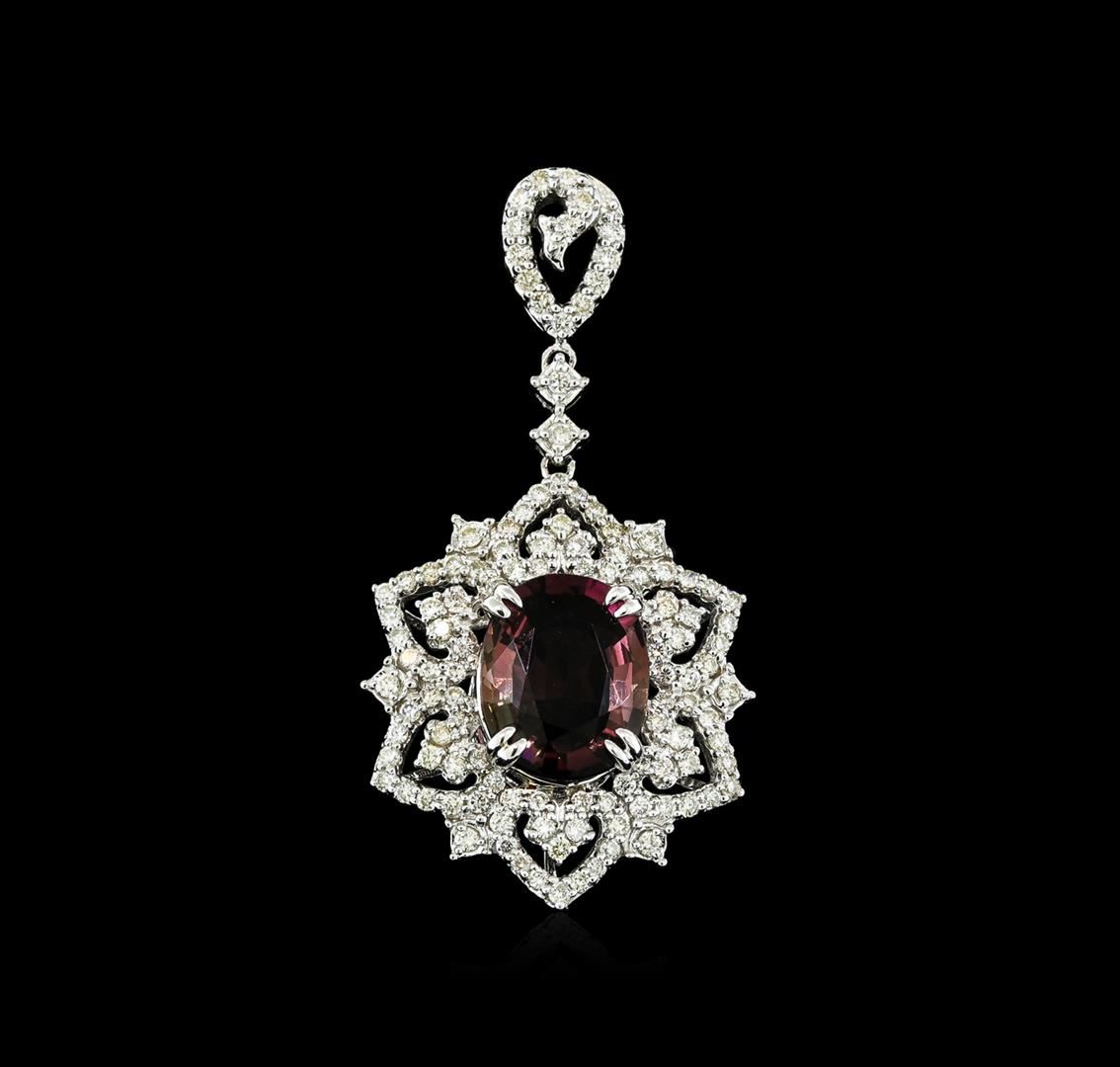 One electronically tested 14KT white gold lady's cast starburst design pendant with a bright polish finish. The featured lady's pendant has a total length of 36.5 millimeters Identified with markings of '14K'. Condition is new, good workmanship. Containing: One prong set oval modified mixed cut natural bi-color tourmaline, measuring 10.02 x 8.05 x 3.63mm, (depth est.) 15%. bulge factor, approximate weight of 2.20ct., clarity is eye clean, very light, very slightly grayish, green color, (GIA G 2/3), cut is very good. The featured tourmaline ranges in color from very light pink to to very light green. Transmitting light with no distortion, transparent. Colored gemstones are presumed to have been subjected to commonly used enhancement processes. Graded in the setting. One Hundred Eighteen prong set round brilliant cut diamonds, measuring 1.20 - 1.10 x 0.69mm (depth est.) approximate total weight of 118 Stones = 0.64ct. Graded in the setting. Clarity SI-1 to SI-2. Color: H - I Cut Good. Total Weight of Colored Stones 2.20ct.. Total Weight of Diamonds 0.64ct.. Total Weight of Pendant 4.10gm GAS Appraised at $3,745.00.