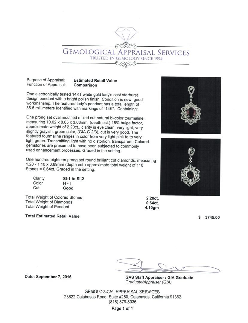 One electronically tested 14KT white gold lady's cast starburst design pendant with a bright polish finish. The featured lady's pendant has a total length of 36.5 millimeters Identified with markings of '14K'. Condition is new, good workmanship. Containing: One prong set oval modified mixed cut natural bi-color tourmaline, measuring 10.02 x 8.05 x 3.63mm, (depth est.) 15%. bulge factor, approximate weight of 2.20ct., clarity is eye clean, very light, very slightly grayish, green color, (GIA G 2/3), cut is very good. The featured tourmaline ranges in color from very light pink to to very light green. Transmitting light with no distortion, transparent. Colored gemstones are presumed to have been subjected to commonly used enhancement processes. Graded in the setting. One Hundred Eighteen prong set round brilliant cut diamonds, measuring 1.20 - 1.10 x 0.69mm (depth est.) approximate total weight of 118 Stones = 0.64ct. Graded in the setting. Clarity SI-1 to SI-2. Color: H - I Cut Good. Total Weight of Colored Stones 2.20ct.. Total Weight of Diamonds 0.64ct.. Total Weight of Pendant 4.10gm GAS Appraised at $3,745.00.