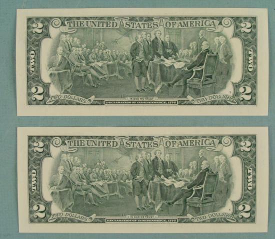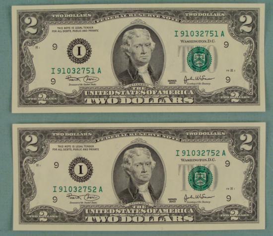 2) 2003 $2 Notes with consecutive serial numbers * * Mint mark: I (Minneapolis) * Condition: Crisp Uncirculated * * Serial number may be different from that pictured