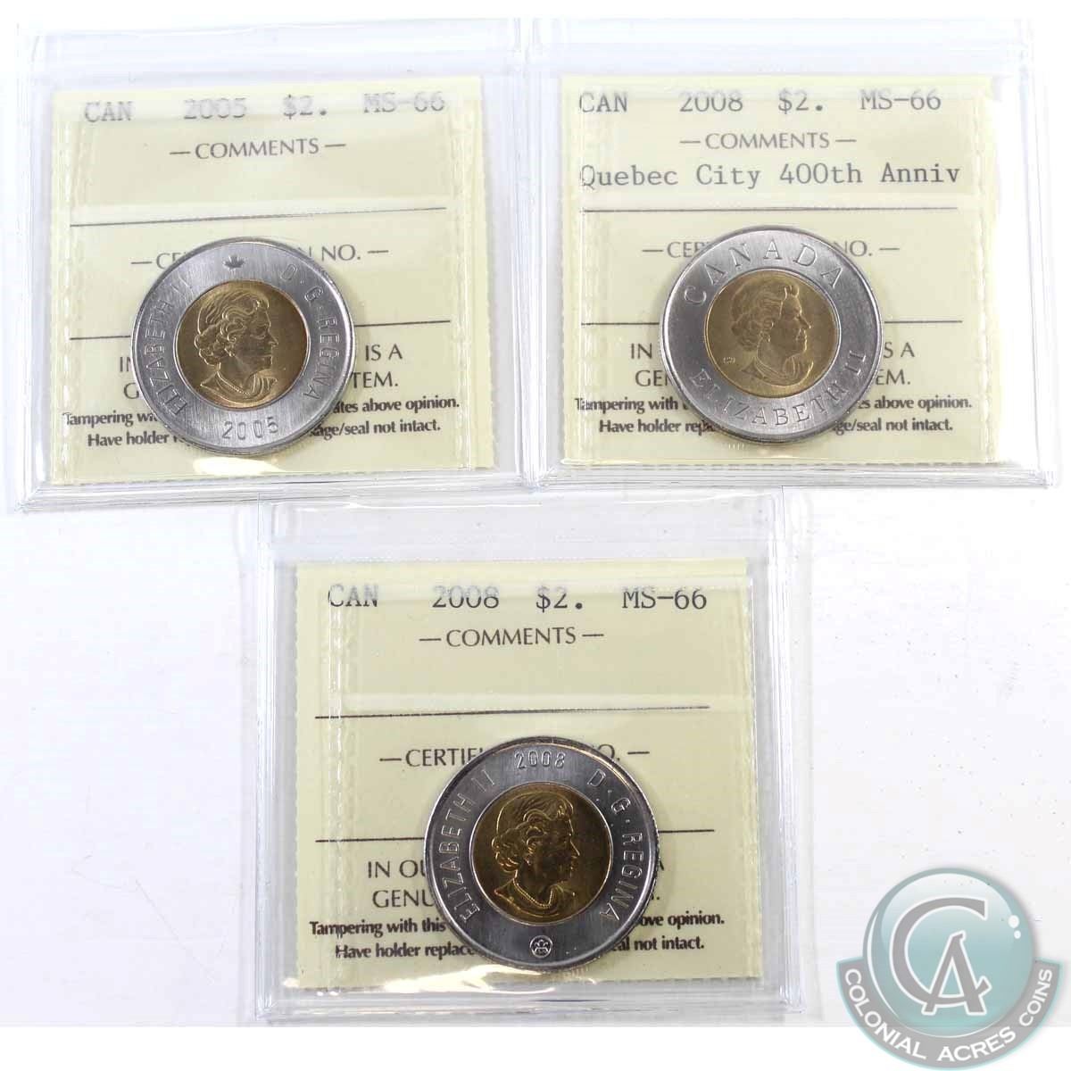 $2 2005, 2008 & 2008 Quebec City ICCS Certified MS-66. 3pcs