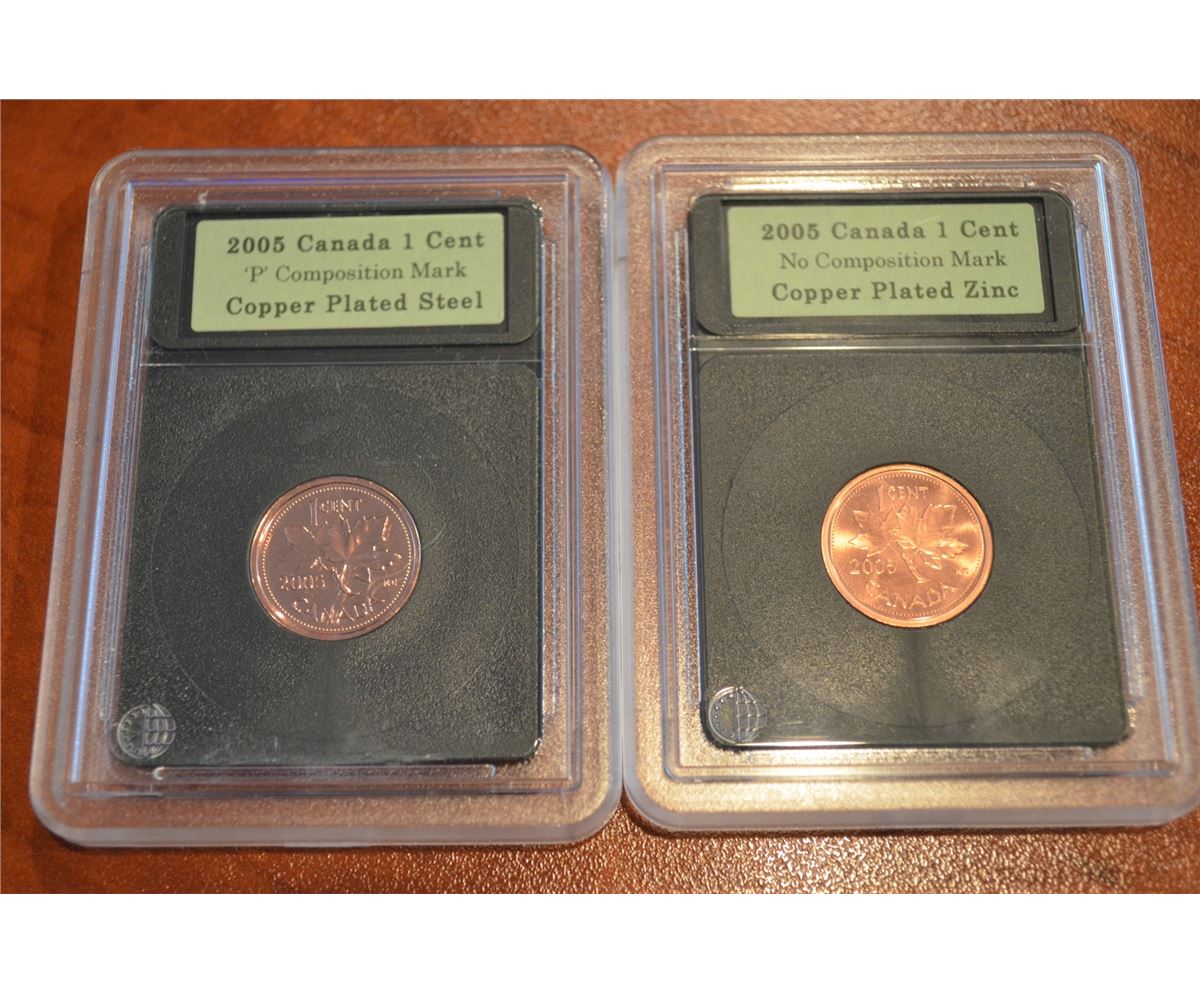 (2) 2005 Canada 1-Cent Slabbed - 1-No Composition Mark (CPZ), 1-"P" Composition Mark (CPS) Lot of 2 Coins