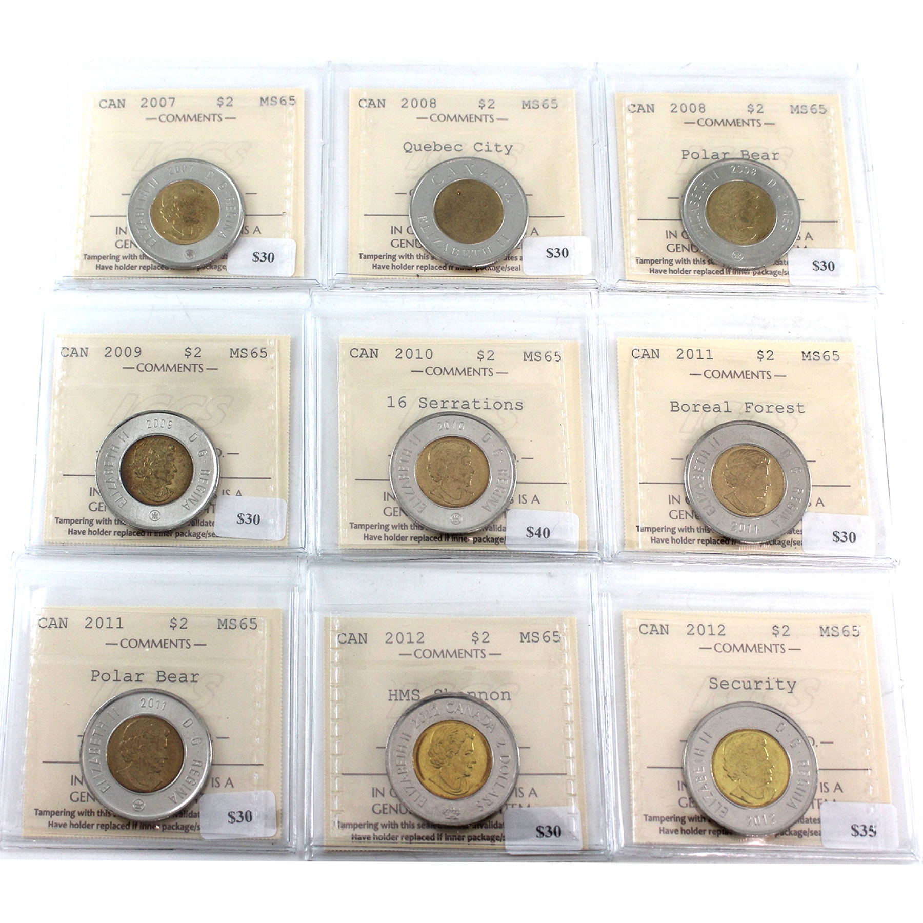 INCLUDES: 2007, 2008 Quebec City, 2008, 2009, 2010 16 Serrations, 2011 Boreal Forest, 2011, 2012 HMS Shannon & 2012 Security. 9pcs.