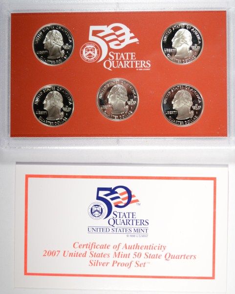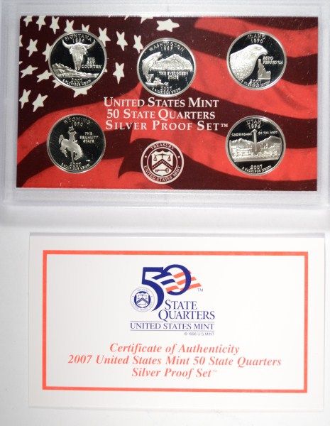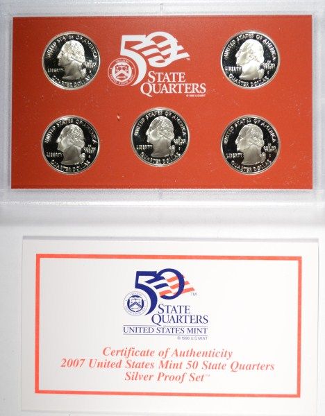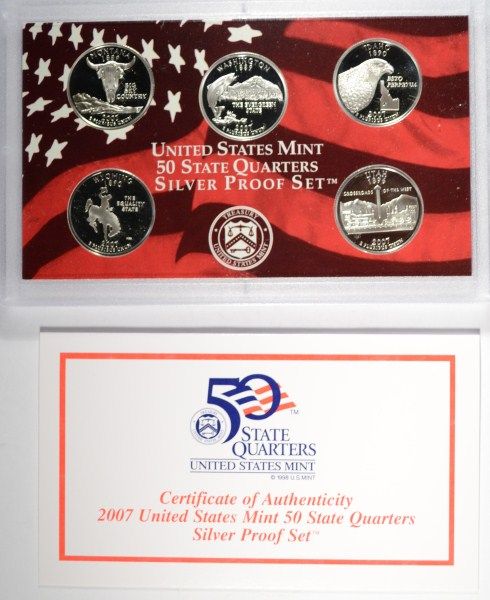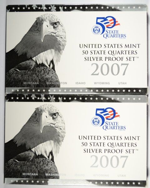 TWO 2007 STATE QUARTER SILVER PROOF SETS IN NICE ORIGINAL MINT PACKAGING, EST. $65.00 TO $70.00