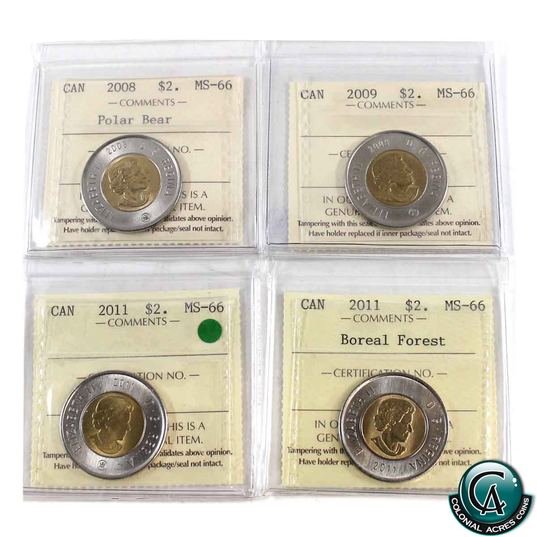 $2 2008, 2009, 2011 & 2011 Boreal Forest ICCS Certified MS-66. 4pcs