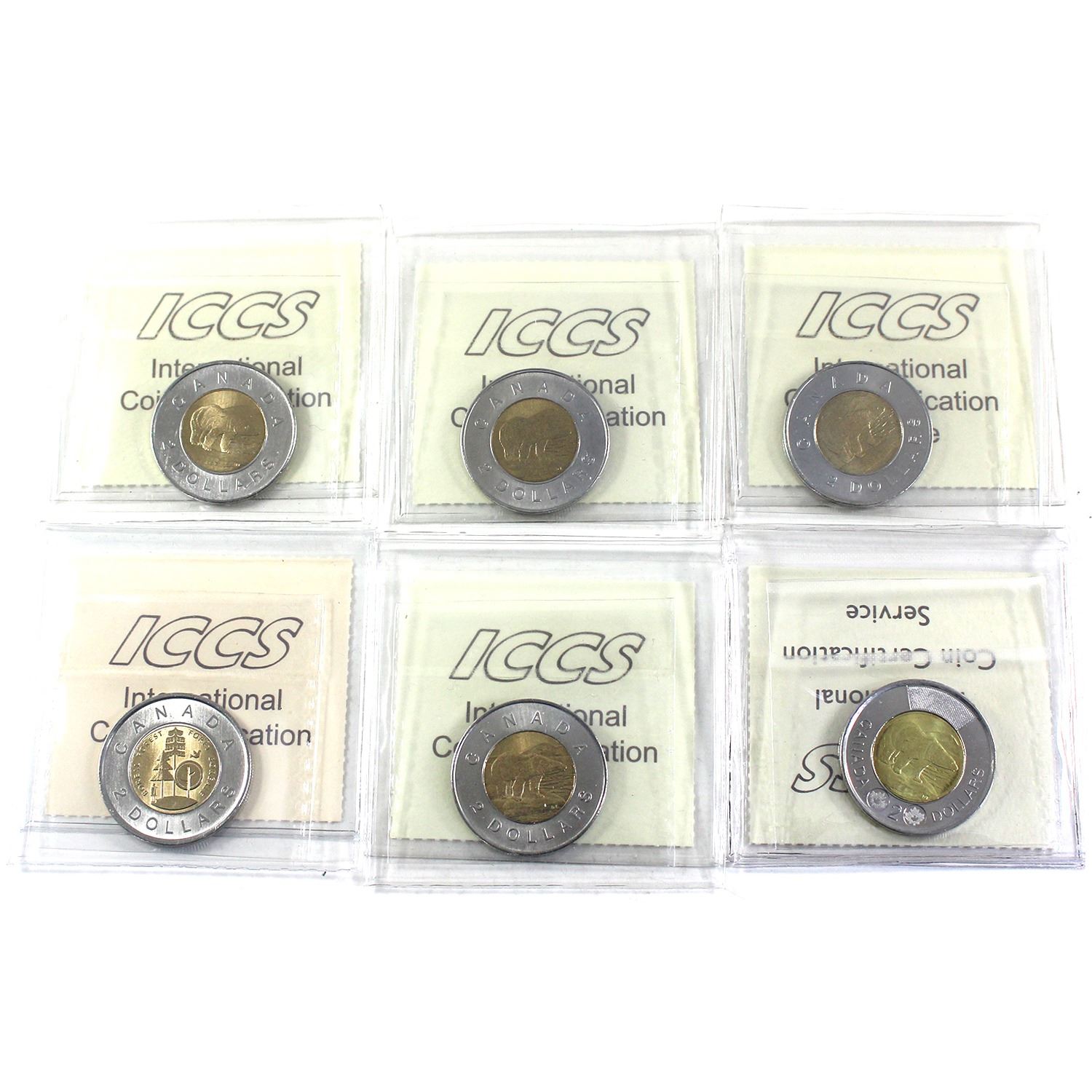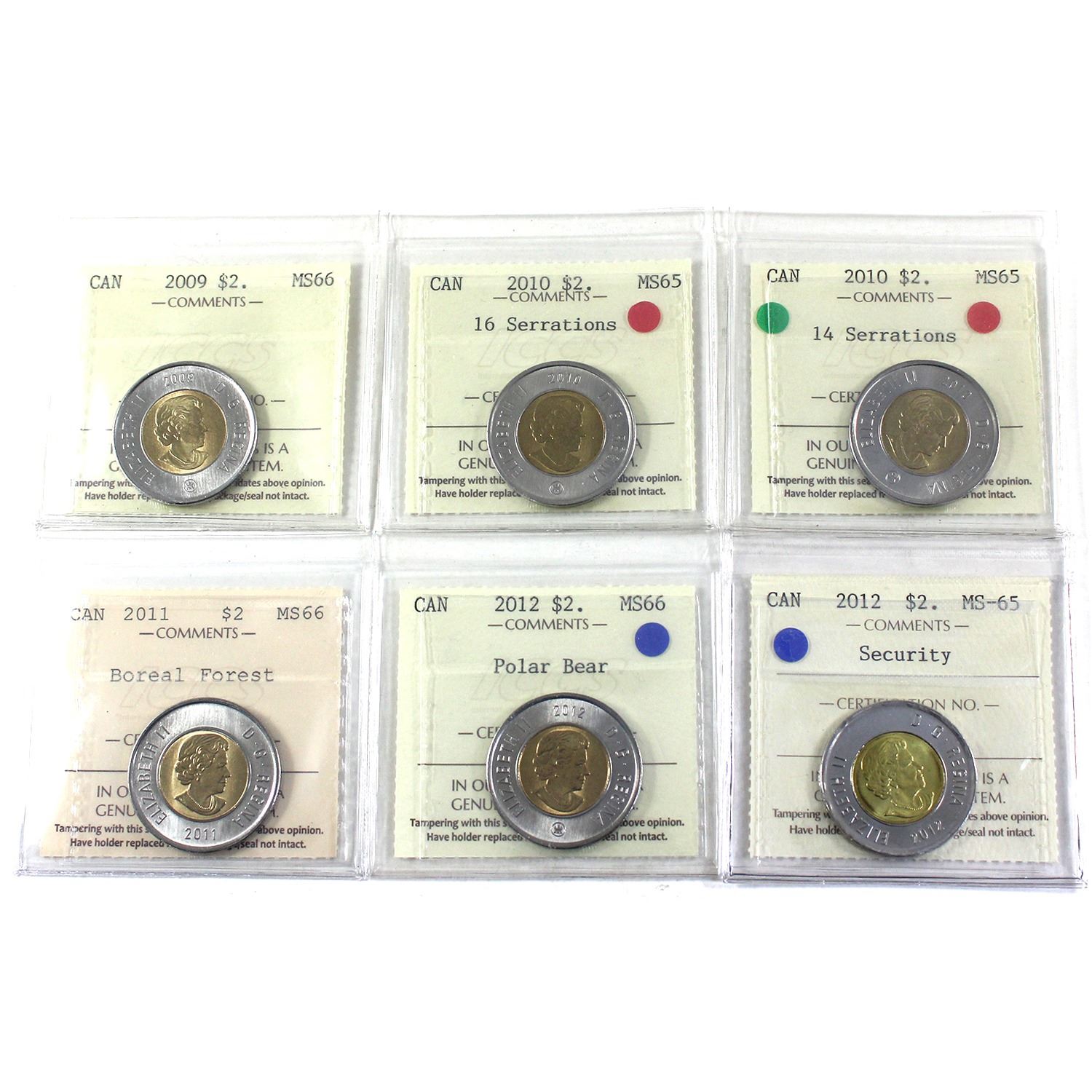 $2 2009 MS66, 2010 16 Serrations MS65, 2010 14 Serrations MS65, 2011 Boreal Forest MS66, 2012 MS66,& 2012 Security MS65 ICCS Certified. 6pcs.