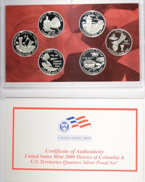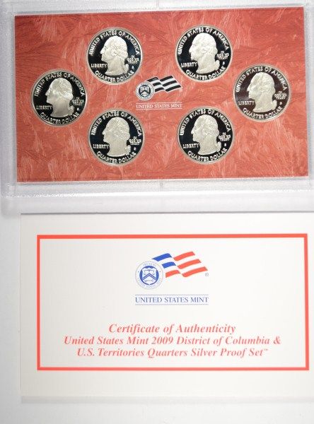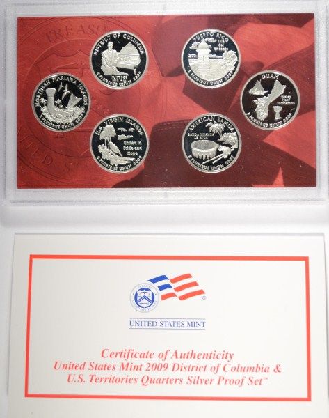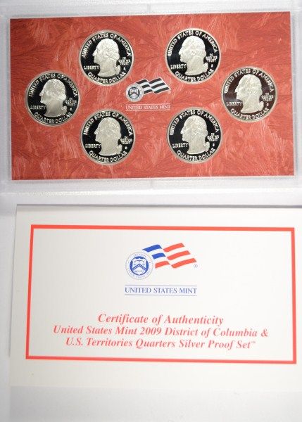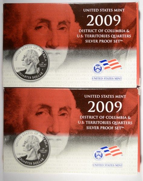 TWO OF THE 2009 D.C. AND TERRITORIES SILVER QUARTER SET IN NICE ORIGINAL PACKAGING, THIS SET HAS SIX SILVER QUARTERS, EST. $75.00 TO $80.00