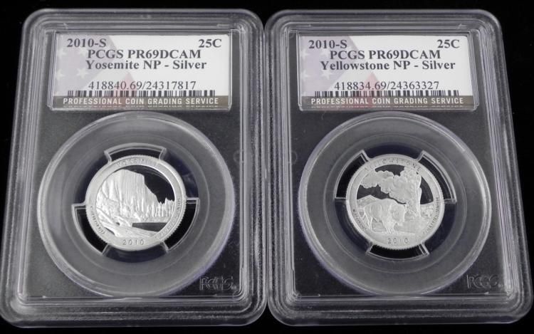 2 National Parks quarters * * * 2010-S 25C Yosemite Silver 2010-S 25C Yellowstone Silver * * Grade: PR69 DCAM (Deep Cameo)Graded by: Professional Coin Grading Service *