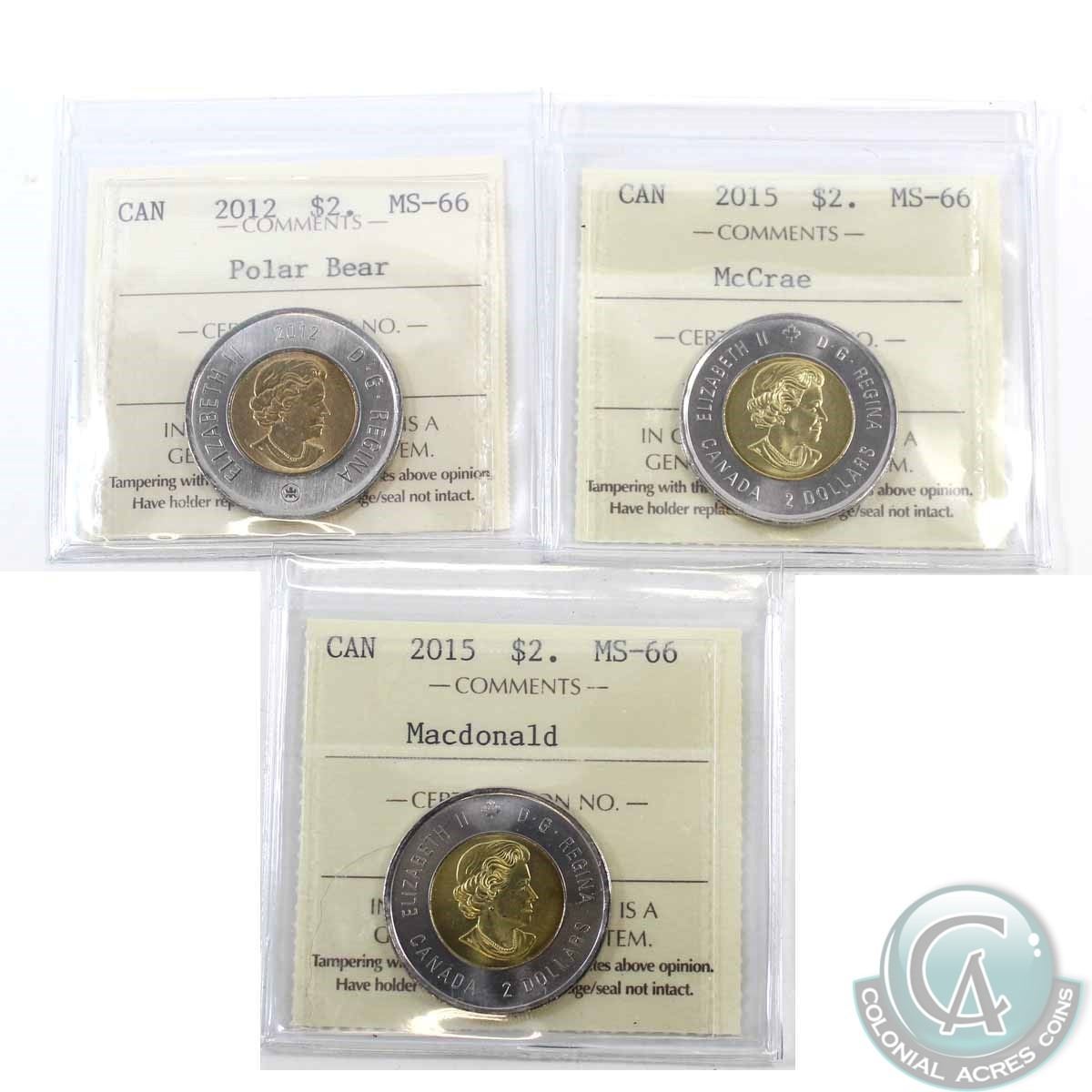 $2 2012, 2015 McCrae & 2015 Macdonald ICCS Certified MS-66. 3pcs