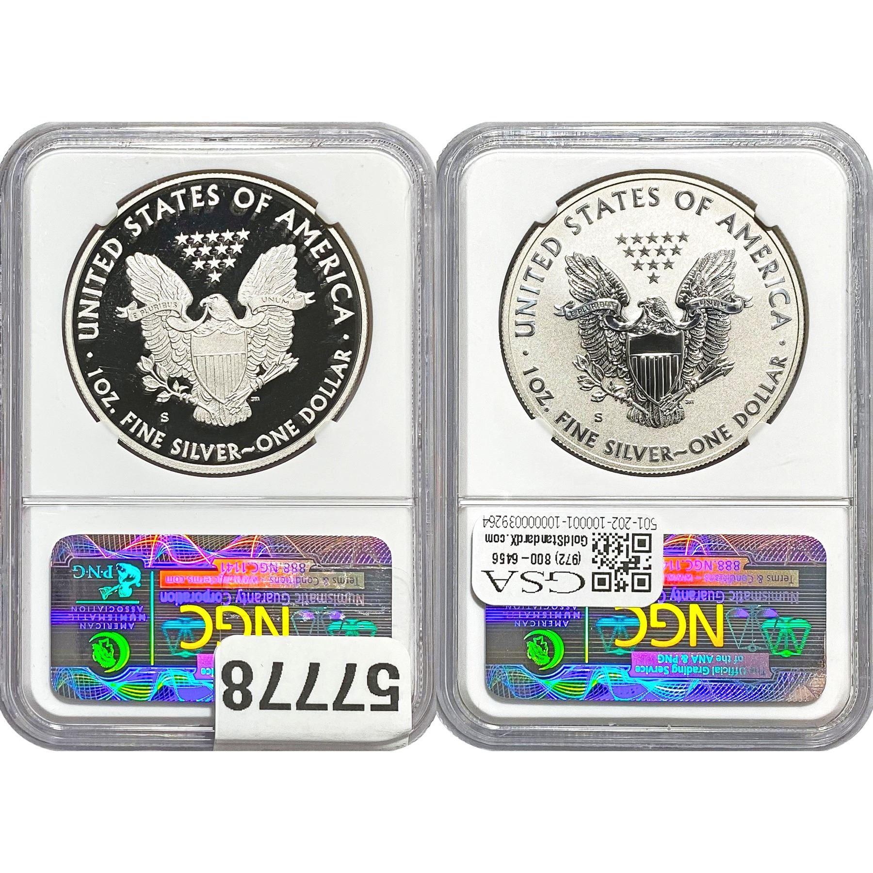 e. Coins sold referencing a third-party grading service are sold “AS IS” without any express or implied warranty, except for a guarantee by GSA that they are genuine. Removal or alteration of the holder, voids all of Bidder’s claims concerning that Product. Certain warranties may be available from the grading services and Bidders are referred to them for further details: Numismatic Guaranty Corporation (NGC), PO Box 4776, Sarasota, FL 34230, www.ngccoin.com/services/writtenguarantee.asp; Professional Coin Grading Services (PCGS), PO Box 9458, Newport Beach, CA 92658, www.pcgs.com/guarantee.html; ANACS, 6555 S. Kenton St., Ste. 303, Englewood, CO 80111; and Independent Coin Grading Co. (ICG), 7901 East Bellview, Ave., Suite 50, Englewood, CO 80111.