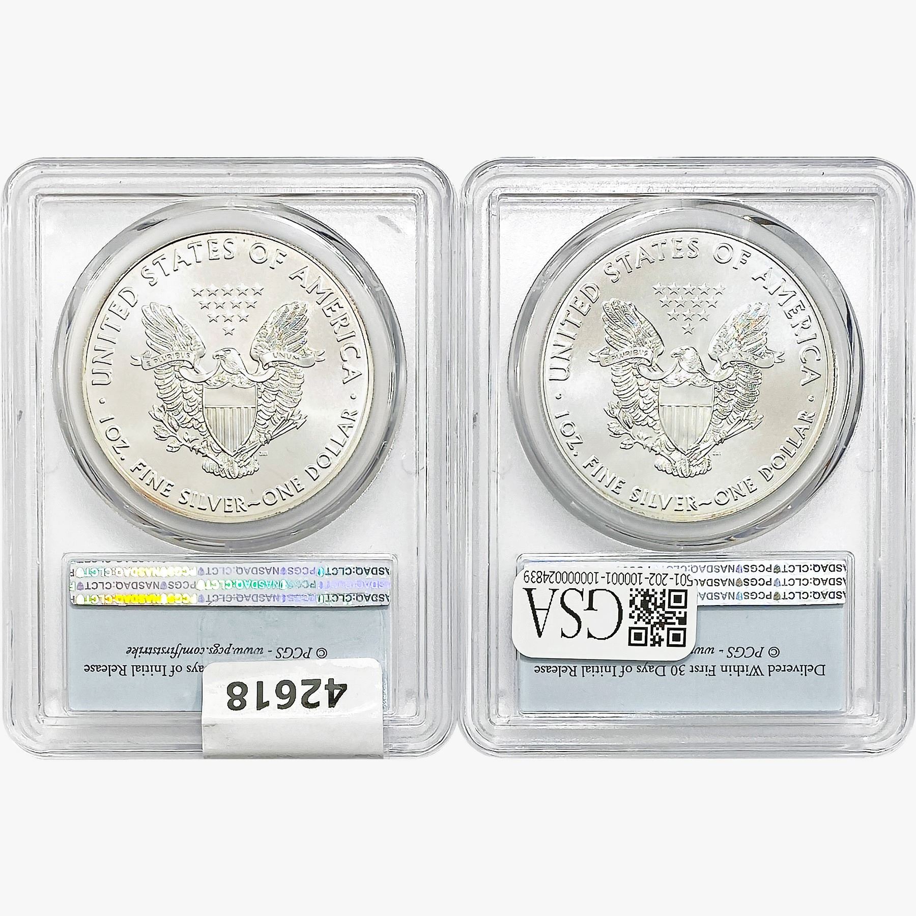 e. Coins sold referencing a third-party grading service are sold “AS IS” without any express or implied warranty, except for a guarantee by GSA that they are genuine. Removal or alteration of the holder, voids all of Bidder’s claims concerning that Product. Certain warranties may be available from the grading services and Bidders are referred to them for further details: Numismatic Guaranty Corporation (NGC), PO Box 4776, Sarasota, FL 34230, www.ngccoin.com/services/writtenguarantee.asp; Professional Coin Grading Services (PCGS), PO Box 9458, Newport Beach, CA 92658, www.pcgs.com/guarantee.html; ANACS, 6555 S. Kenton St., Ste. 303, Englewood, CO 80111; and Independent Coin Grading Co. (ICG), 7901 East Bellview, Ave., Suite 50, Englewood, CO 80111.