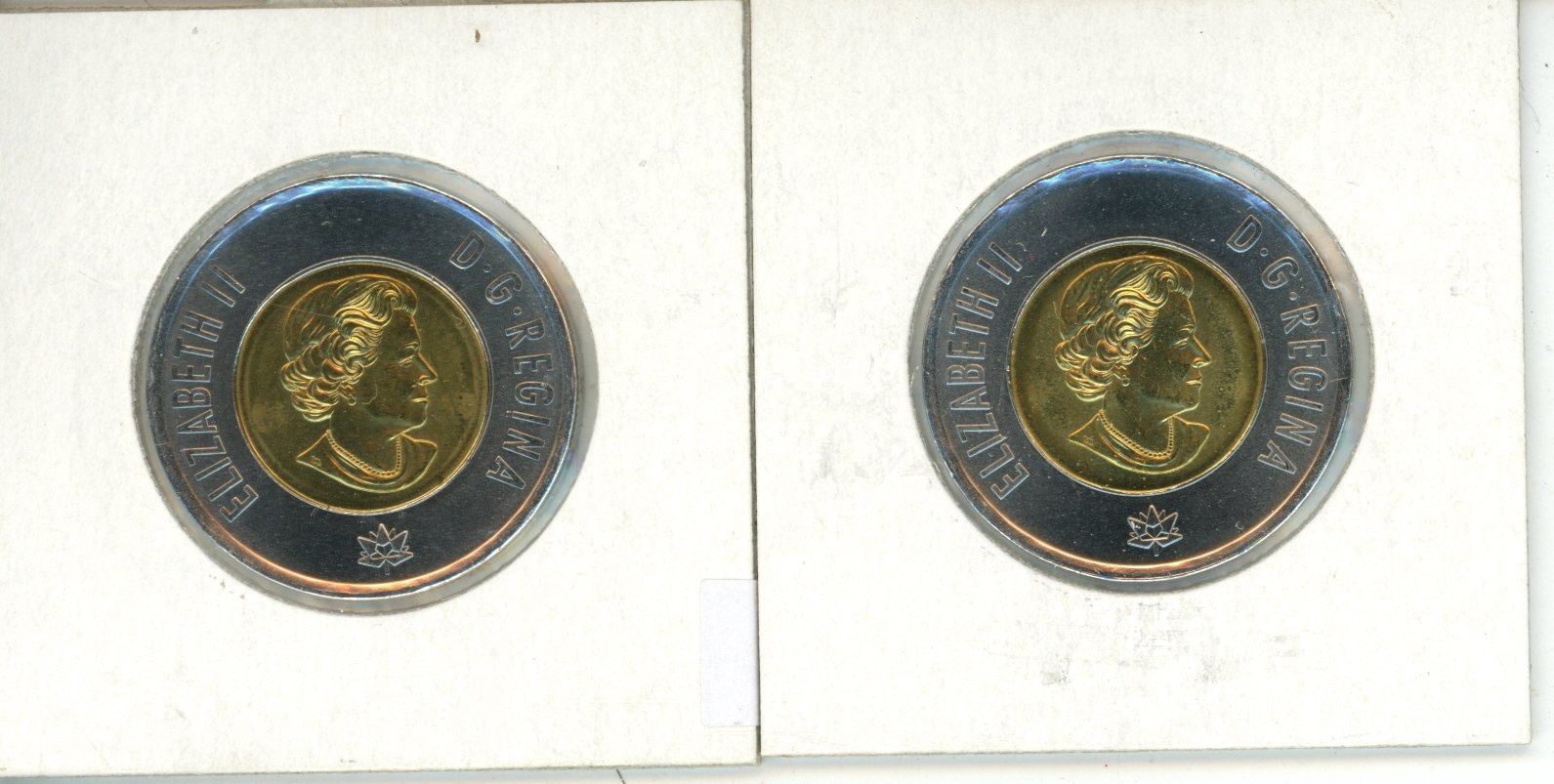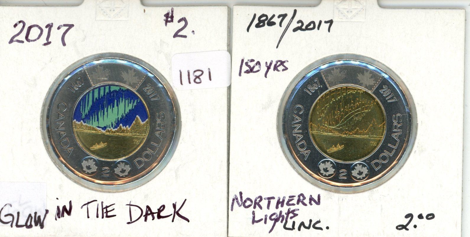 2 2017 Canadian 2 Dollars: 1 Glow in the Dark Northern Lights, 1 Northern Lights Line