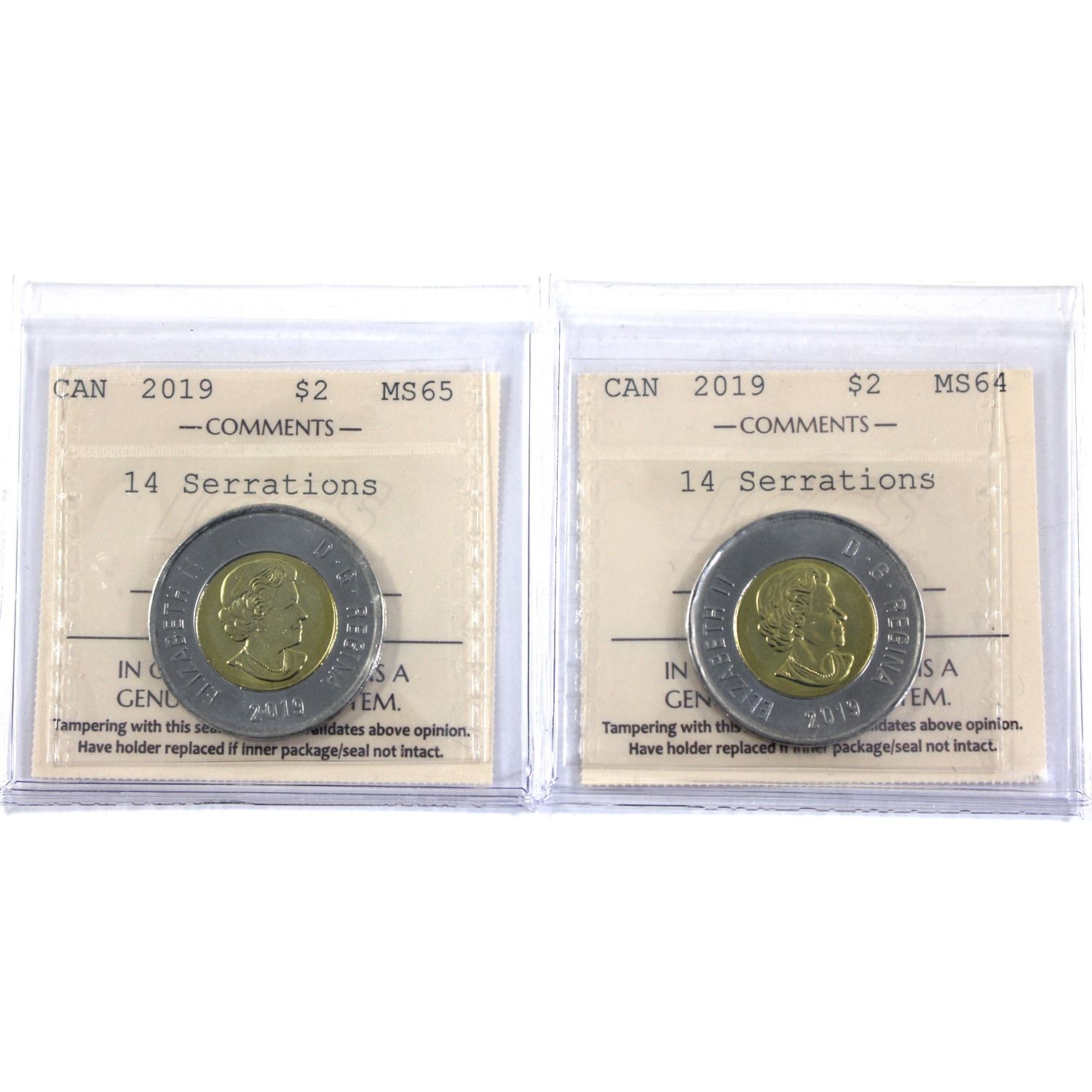 $2 2019 14 Serrations ICCS MS64 & MS65. 2pcs.