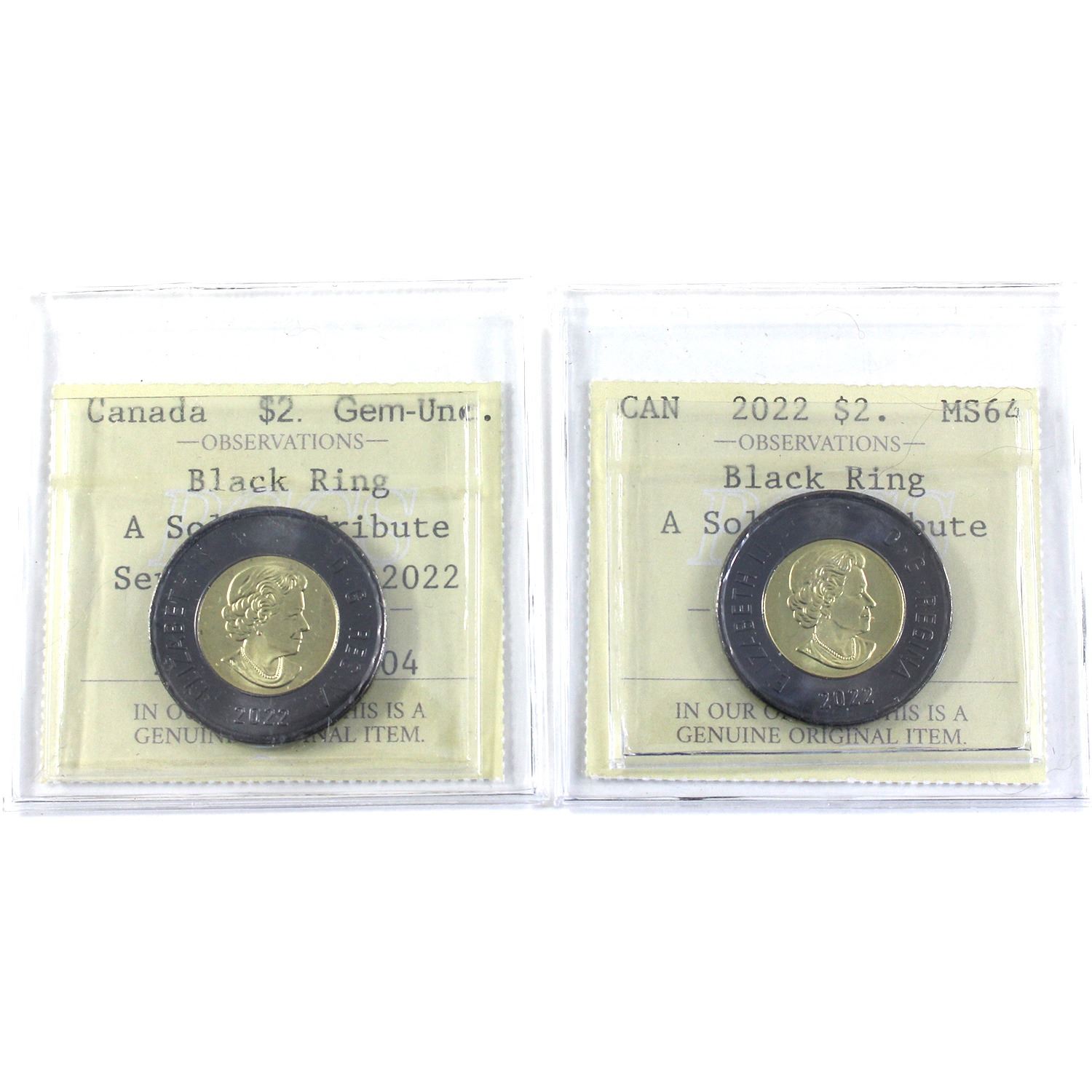 $2 2022 Black Ring-A Solemn Tribute PCCS (Professional Coin Certification System) MS64 & Gem UNC. Holders may be lightly scratched. 2pcs.