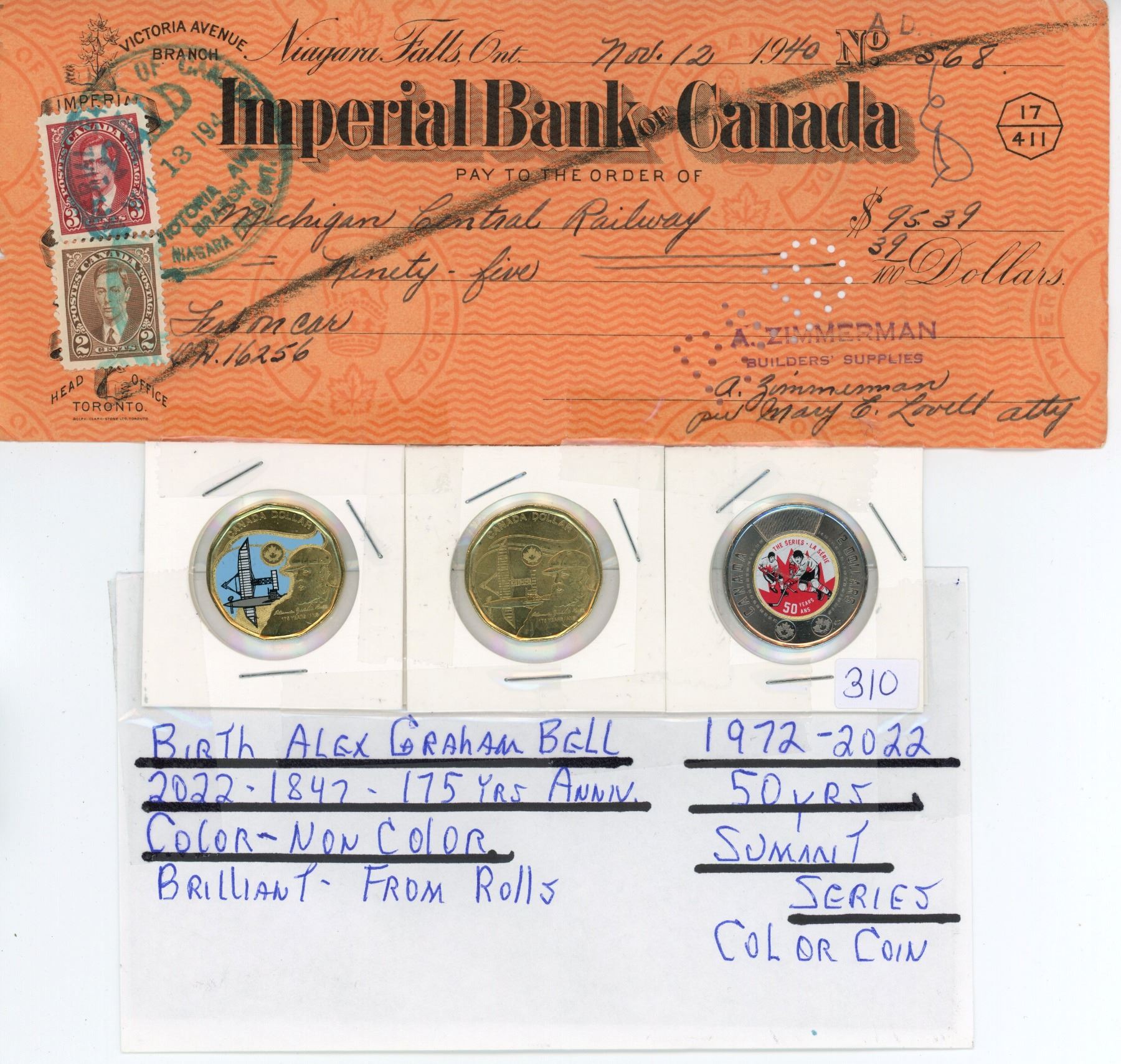 2 (2022) Canadian 1 dollar coins of Alex Graham Bell, Summit series Toonie (2022) & Imperial Bank of Canada cheque 1940