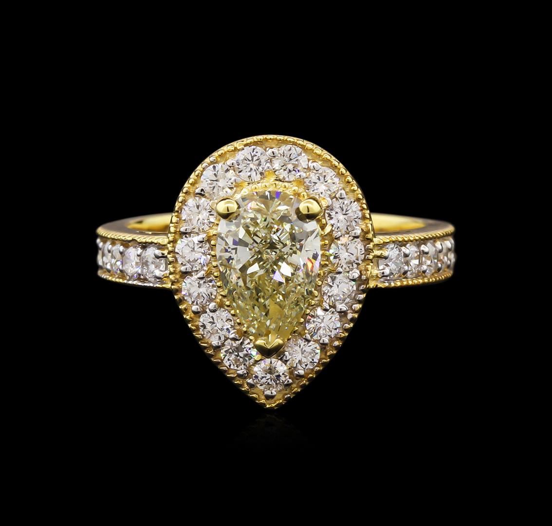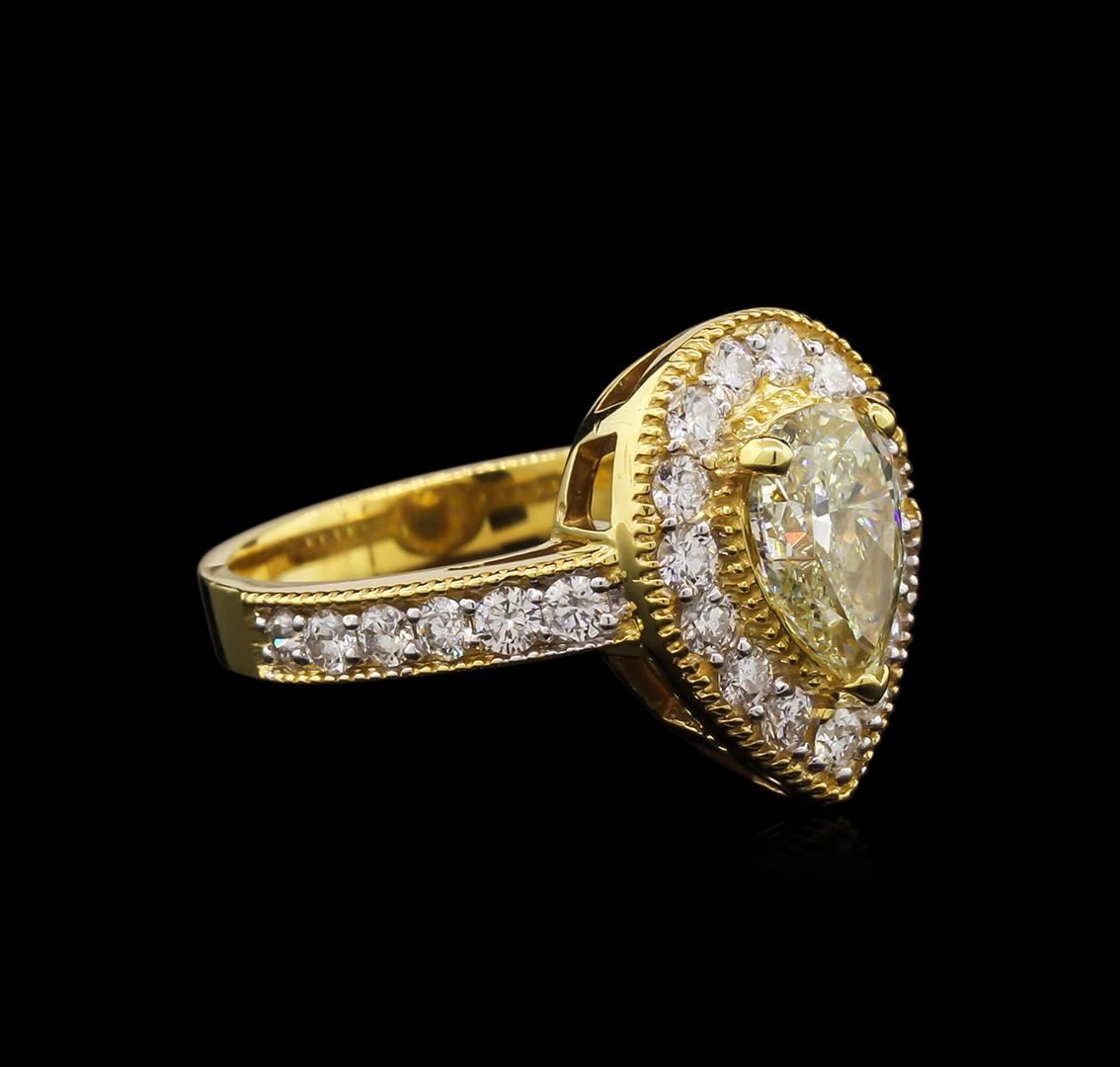 One electronically tested 14KT yellow gold lady's combination cast & assembled fashion ring with a cathedral shank with a bright polish with milgrain detailing finish. The featured lady's ring has a shank measuring 3.00 millimeters wide. Identified with markings of "K14". Condition is new, good workmanship. Containing: One prong set pear shaped cut diamond, measuring 9.10 x 5.94 x 3.74mm (depth est.) , 10.00.%. GTCF approximate weight of 1.30ct. Graded in the setting. Clarity: SI-1 Cut Very Good Twenty-Seven prong set round brilliant cut diamonds, measuring 2.10 - 2.00 x 1.31mm (depth est.) approximate total weight of 27 Stones = 0.90ct. Graded in the setting. Clarity: SI-1 to SI-2. Color: G - I. Cut Good. Total Weight of Diamonds 2.20ct. Total Weight of Ring 5.20gm. GAS Appraised at $25,705.00.