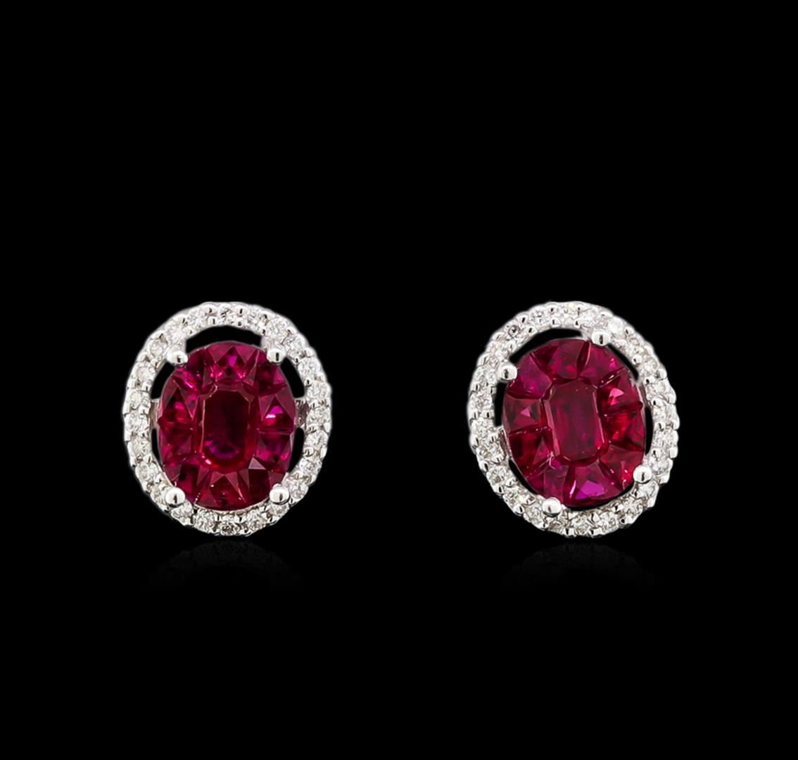 One pair electronically tested 18KT white gold lady's combination cast & assembled halo stud earrings with friction posts with a bright polish finish. Identified with markings of "750". Condition is new, good workmanship. Containing: Twenty-two invisible set oval mosaic cut natural rubies, measuring 7.65 x 6.40 x 2.00mm, approximate total weight of 2.20ct., clarity is eye clean, type II, medium dark, strong, red color, (GIA R 6/5), cut is very good. Each oval mosaic is made up of 11 fancy cut rubies. Colored gemstones are presumed to have been subjected to commonly used enhancement processes. Graded in the setting. Forty-Eight prong set round brilliant cut diamonds, measuring 1.20 - 1.10 x 0.72mm (depth est.) approximate total weight of 48 Stones = 0.30ct. Graded in the setting. Clarity: VS-1 to VS-2. Color: G - Very Good. Total Weight of Colored Stones 2.20ct. Total Weight of Diamonds 0.30ct. Total Weight of Earrings 3.40gm. GAS Appraised at $7,135.00.
