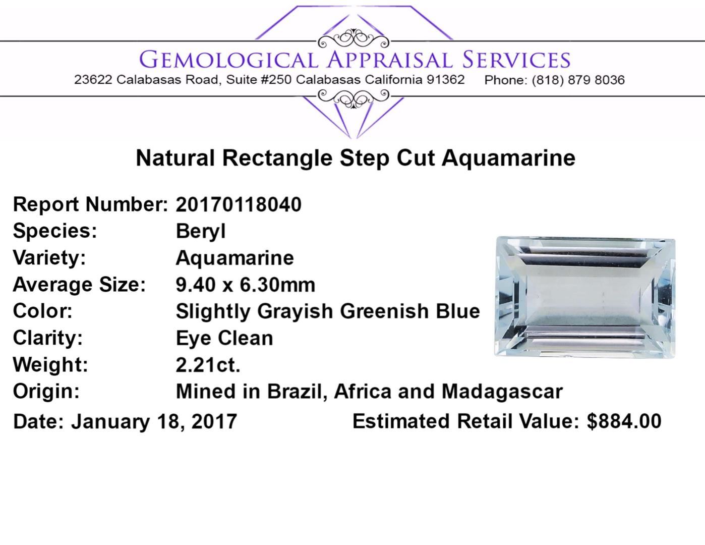 One natural rectangle step cut aquamarine with an exact weight of 2.21ct., clarity is eye clean, slightly grayish greenish blue. Gemological Appraisals Services estimates the retail value at $884 GAS Appraised.