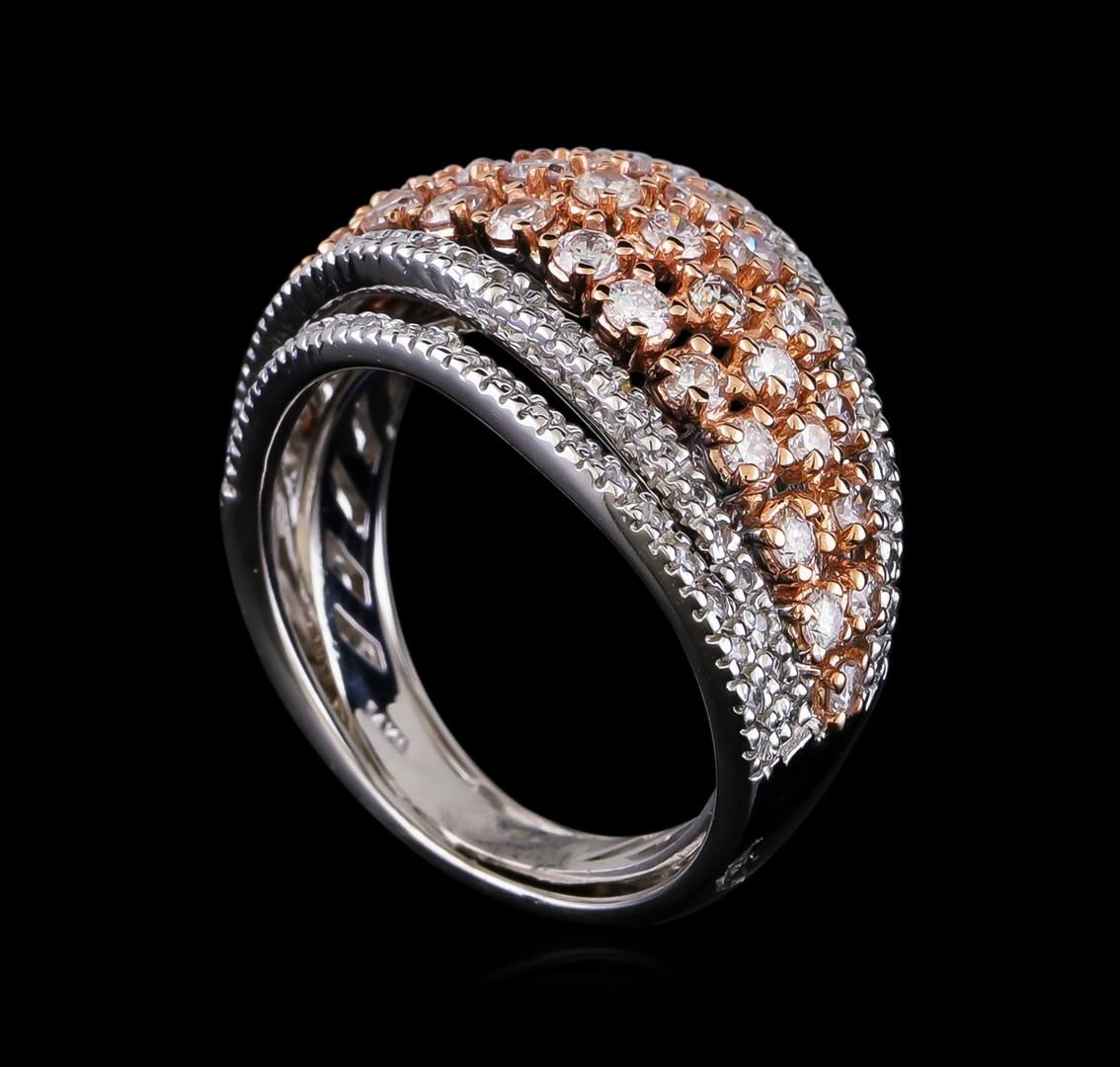 One electronically tested 14KT rose and white gold lady's combination cast & assembled fashion ring with a bright polish finish. The featured lady's ring has a 7 row wide band motif with a inter spring shank measuring 5.0 millimeters in width. Identified with markings of "14K". Condition is new, good workmanship. Containing: Thirty-Five prong set round brilliant cut diamonds, measuring 2.30 - 1.90 x 1.30mm (depth est.) approximate total weight of 35 Stones = 1.29ct. Graded in the setting. Clarity: SI-1 to SI-2. Color: G - Good Ninety prong set round brilliant cut diamonds, measuring 1.40 - 1.35 x 0.86mm (depth est.) approximate total weight of 90 Stones = 0.92ct. Graded in the setting. Clarity: SI-1 to I-1. Color: H - I. Cut Good. Total Weight of Diamonds 2.21ct. Total Weight of Ring 10.60gm. GAS Appraised at $6,630.00.