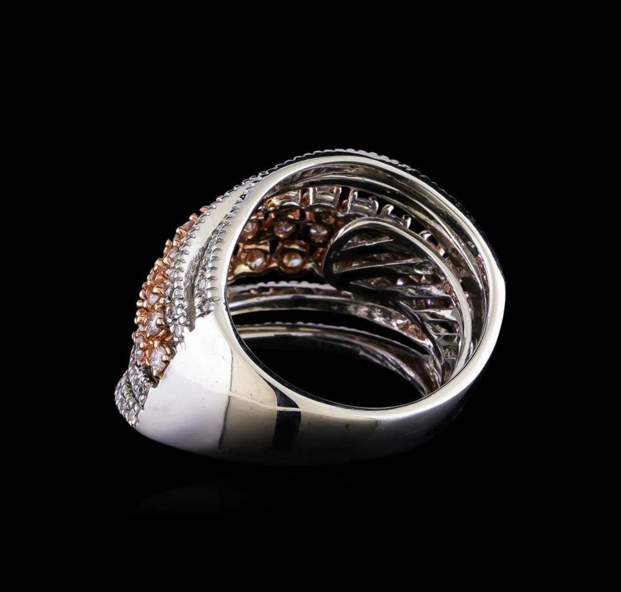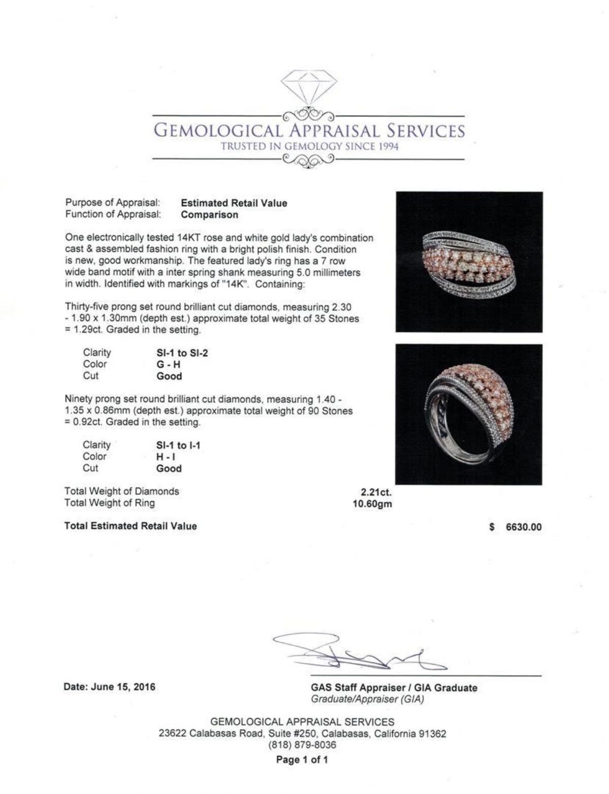 One electronically tested 14KT rose and white gold lady's combination cast & assembled fashion ring with a bright polish finish. The featured lady's ring has a 7 row wide band motif with a inter spring shank measuring 5.0 millimeters in width. Identified with markings of "14K". Condition is new, good workmanship. Containing: Thirty-Five prong set round brilliant cut diamonds, measuring 2.30 - 1.90 x 1.30mm (depth est.) approximate total weight of 35 Stones = 1.29ct. Graded in the setting. Clarity: SI-1 to SI-2. Color: G - Good Ninety prong set round brilliant cut diamonds, measuring 1.40 - 1.35 x 0.86mm (depth est.) approximate total weight of 90 Stones = 0.92ct. Graded in the setting. Clarity: SI-1 to I-1. Color: H - I. Cut Good. Total Weight of Diamonds 2.21ct. Total Weight of Ring 10.60gm. GAS Appraised.
