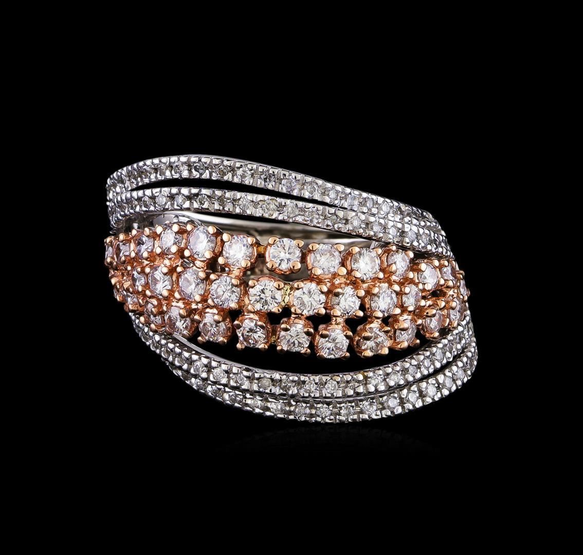 One electronically tested 14KT rose and white gold lady's combination cast & assembled fashion ring with a bright polish finish. The featured lady's ring has a 7 row wide band motif with a inter spring shank measuring 5.0 millimeters in width. Identified with markings of "14K". Condition is new, good workmanship. Containing: Thirty-Five prong set round brilliant cut diamonds, measuring 2.30 - 1.90 x 1.30mm (depth est.) approximate total weight of 35 Stones = 1.29ct. Graded in the setting. Clarity: SI-1 to SI-2. Color: G - Good Ninety prong set round brilliant cut diamonds, measuring 1.40 - 1.35 x 0.86mm (depth est.) approximate total weight of 90 Stones = 0.92ct. Graded in the setting. Clarity: SI-1 to I-1. Color: H - I. Cut Good. Total Weight of Diamonds 2.21ct. Total Weight of Ring 10.60gm. GAS Appraised.