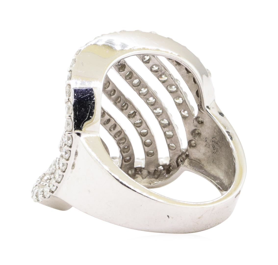 One electronically tested 14KT white gold lady's cast fashion ring with a oval halo saddle motif with a bright polish finish. The featured lady's ring has seven inner wave motifs and a shank measuring 4.00 millimeters wide. Identified with markings of '14K'. Condition is new, good workmanship. Containing: One Hundred Nine prong set round brilliant cut diamonds, measuring 1.80 - 1.70 x 1.09mm (depth est.) approximate total weight of 109 Stones = 2.21ct. Graded in the setting. Color G - H Clarity VS-2 to SI-1 Cut Very Good. Total Weight of Diamonds 2.21ct.. Total Weight of Ring 9.90gm GAS Appraised at $8525.00. GAS Appraised.