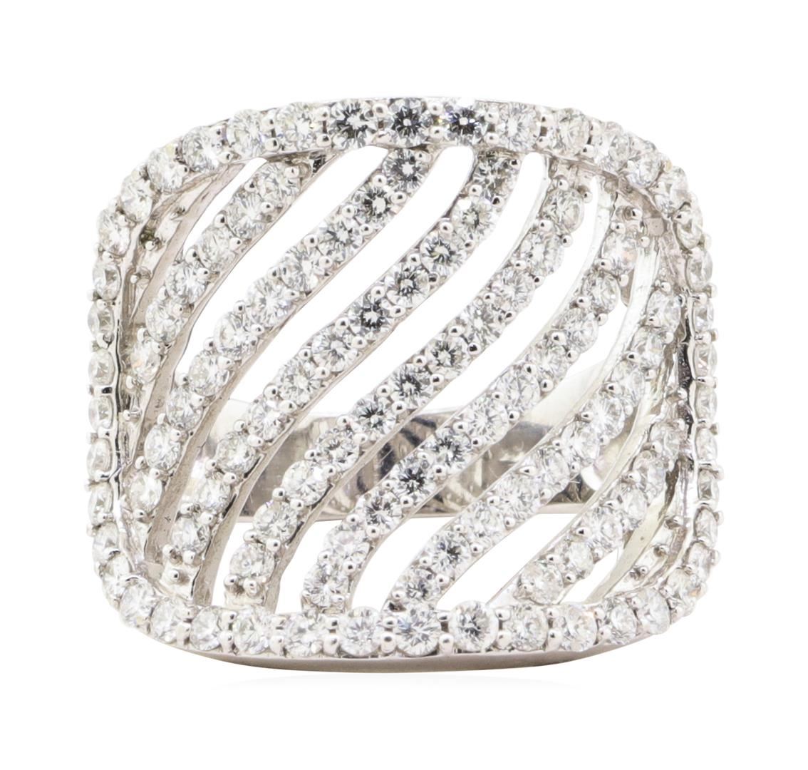 One electronically tested 14KT white gold lady's cast fashion ring with a oval halo saddle motif with a bright polish finish. The featured lady's ring has seven inner wave motifs and a shank measuring 4.00 millimeters wide. Identified with markings of '14K'. Condition is new, good workmanship. Containing: One Hundred Nine prong set round brilliant cut diamonds, measuring 1.80 - 1.70 x 1.09mm (depth est.) approximate total weight of 109 Stones = 2.21ct. Graded in the setting. Color G - H Clarity VS-2 to SI-1 Cut Very Good. Total Weight of Diamonds 2.21ct.. Total Weight of Ring 9.90gm GAS Appraised at $8525.00. GAS Appraised.