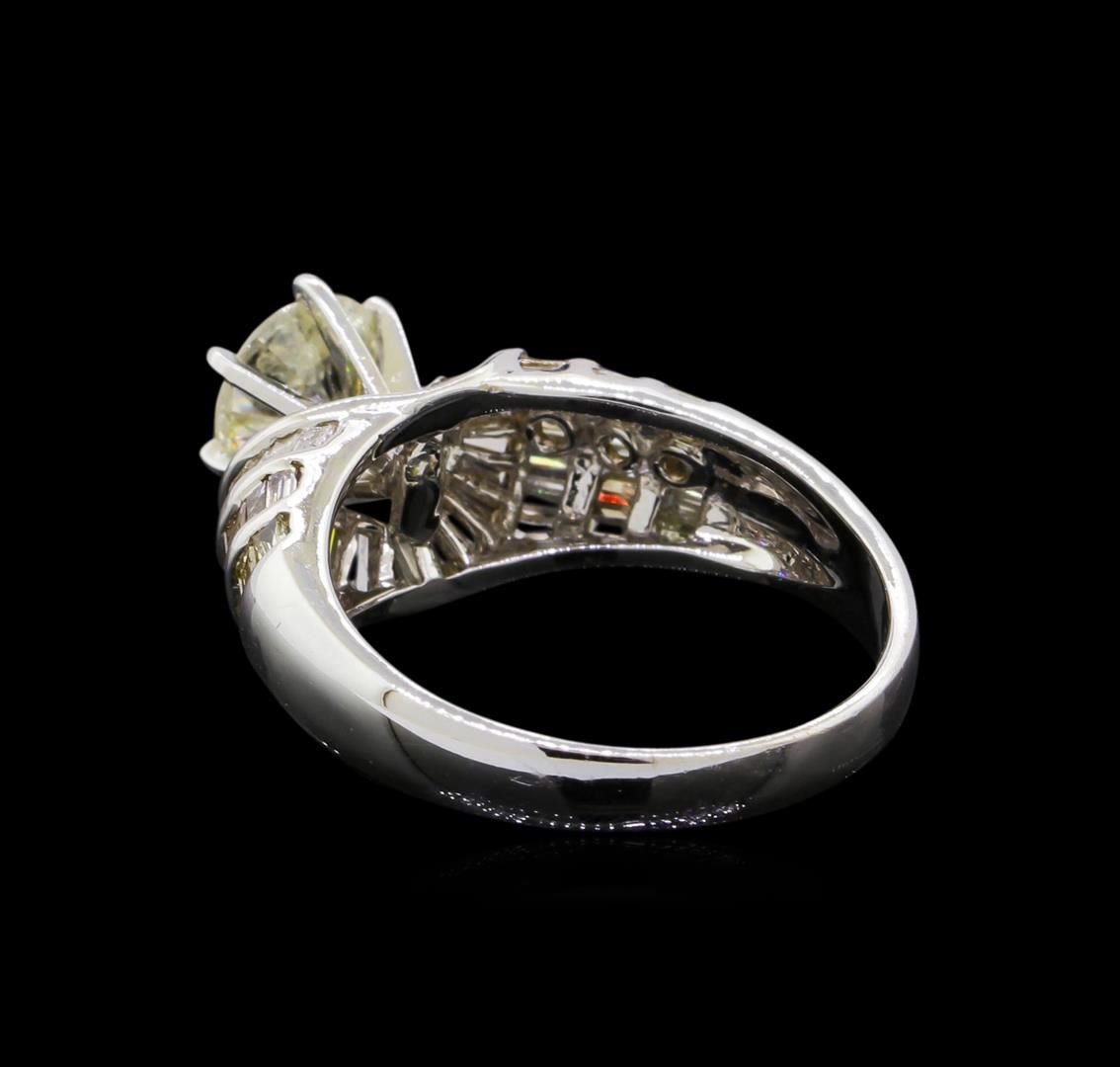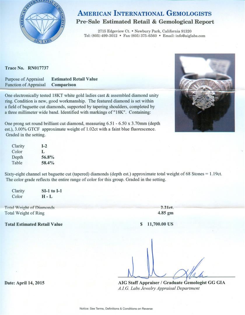 One electronically tested 18KT white gold ladies cast & assembled diamond unity ring. The featured diamond is set within a field of baguette cut diamonds, supported by tapering shoulders, completed by a three millimeter wide band. Identified with markings of "18K". Condition is new, good workmanship. Containing: One prong set round brilliant cut diamond, measuring 6.51 - 6.50 x 3.70mm (depth est.), 3.00.%. GTCF approximate weight of 1.02ct with a faint blue fluorescence. Graded in the setting. Clarity: I-2. Color: 56.8%. Table 58.4%. Sixty-Eight channel set baguette cut (tapered) diamonds (depth est.) approximate total weight of 68 Stones = 1.19ct. The color grade reflects the entire range of color for this group. Graded in the setting. Clarity: SI-1 to I-1. Color: H - L. Total Weight of Diamonds 2.21ct. Total Weight of Ring 4.85gm. AIG Appraised at $11,700.00.