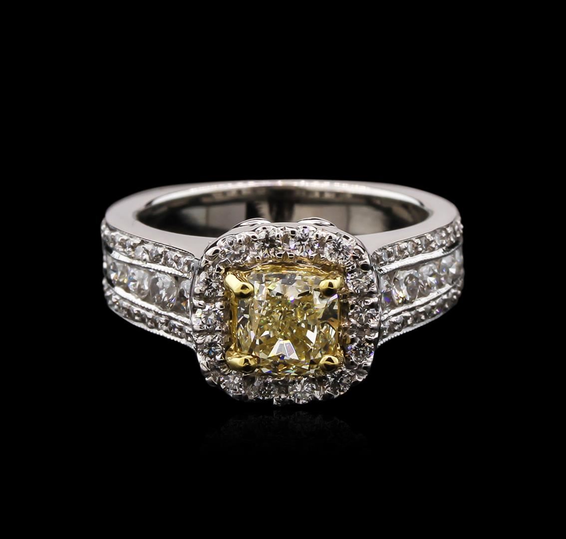 One electronically tested 14KT white and yellow gold lady's cast wedding ring with a European shank with a bright polish with milgrain detailing finish. The featured lady's ring has a shank measuring 4.15 millimeters wide. Identified with markings of "14K". Condition is new, good workmanship. Containing: One prong set cushion cut diamond, measuring 5.93 x 5.88 x 3.65mm (depth est.) , 15.00.%. GTCF approximate weight of 1.29ct. Graded in the setting. Clarity: VS-2 Cut Very Good Ten channel set round brilliant cut diamonds, measuring 2.70 - 1.80 x 1.46mm (depth est.) approximate total weight of 10 Stones = 0.52ct. Graded in the setting. Clarity: SI-1 to SI-2. Color: H - I. Cut Good Sixteen prong set round brilliant cut diamonds, measuring 1.70 - 1.60 x 1.07mm (depth est.) approximate total weight of 16 Stones = 0.29ct. Graded in the setting. Clarity: VS-2 to SI-2. Color: H - I. Cut Very Good Forty-Four bead set round brilliant cut diamonds, measuring 0.90 - 0.80 x 0.55mm (depth est.) approximate total weight of 44 Stones = 0.11ct. Graded in the setting. Clarity: SI-1 to I-1. Color: H - I. Cut Good. Total Weight of Diamonds 2.21ct. Total Weight of Ring 9.00gm. GAS Appraised at $24,400.00.