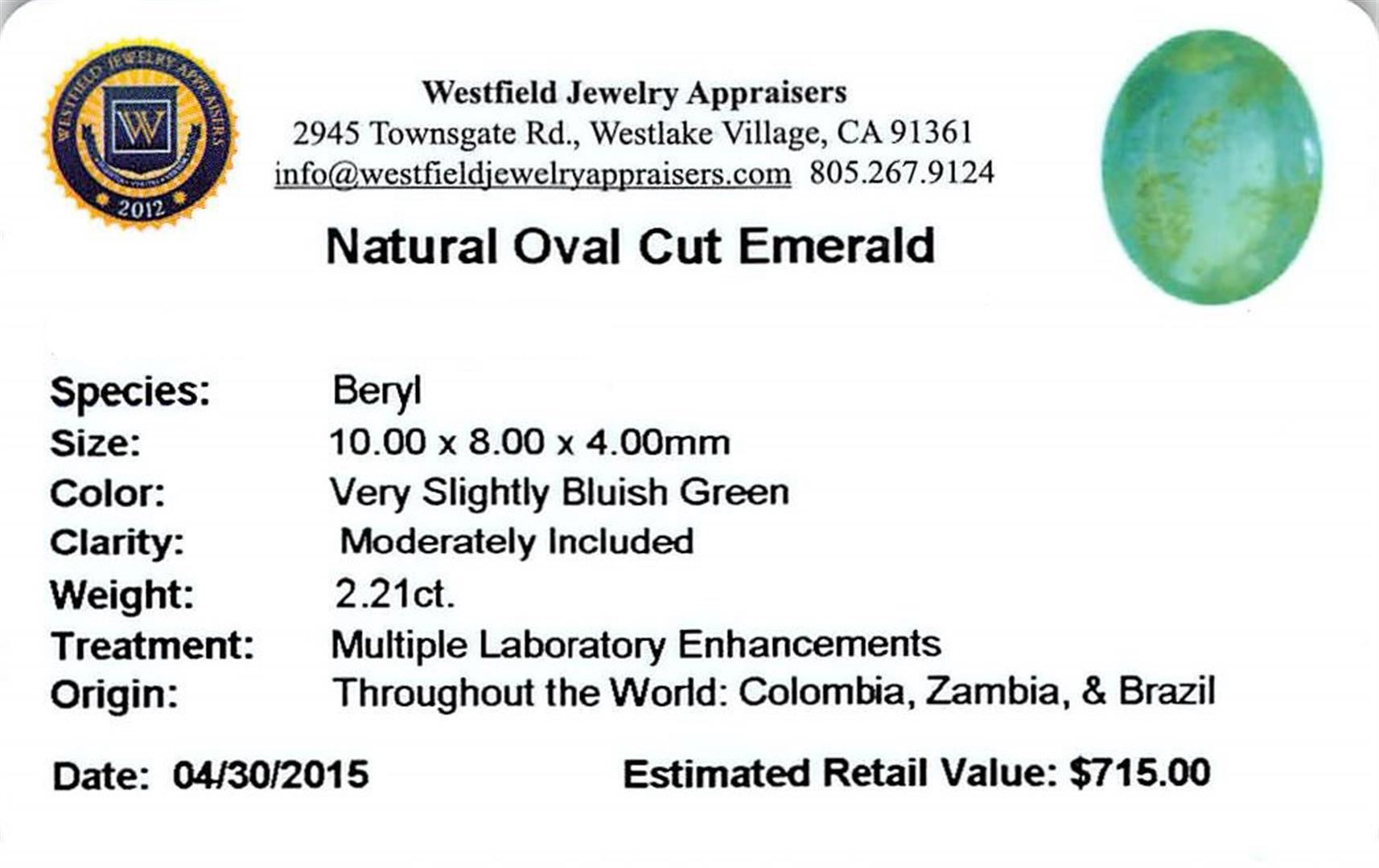 One oval mixed cut natural emerald exact weight 2.21ct., clarity is moderately included, type III, medium dark, very slightly grayish, very slightly bluish green color, (GIA vslbG 6/3), cut is good. Westfield Appraised at $715.00.