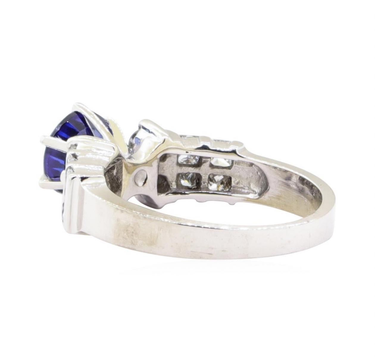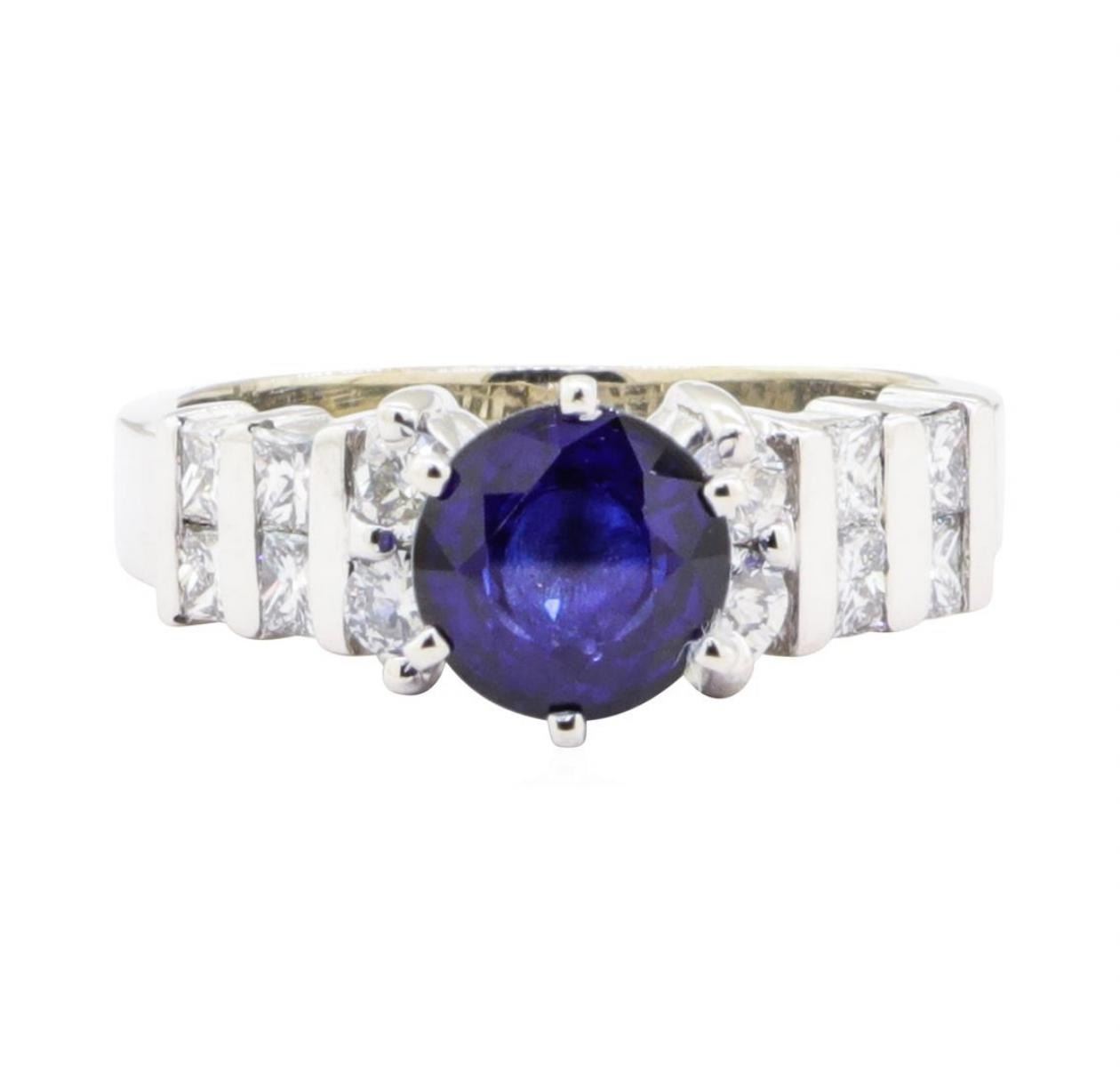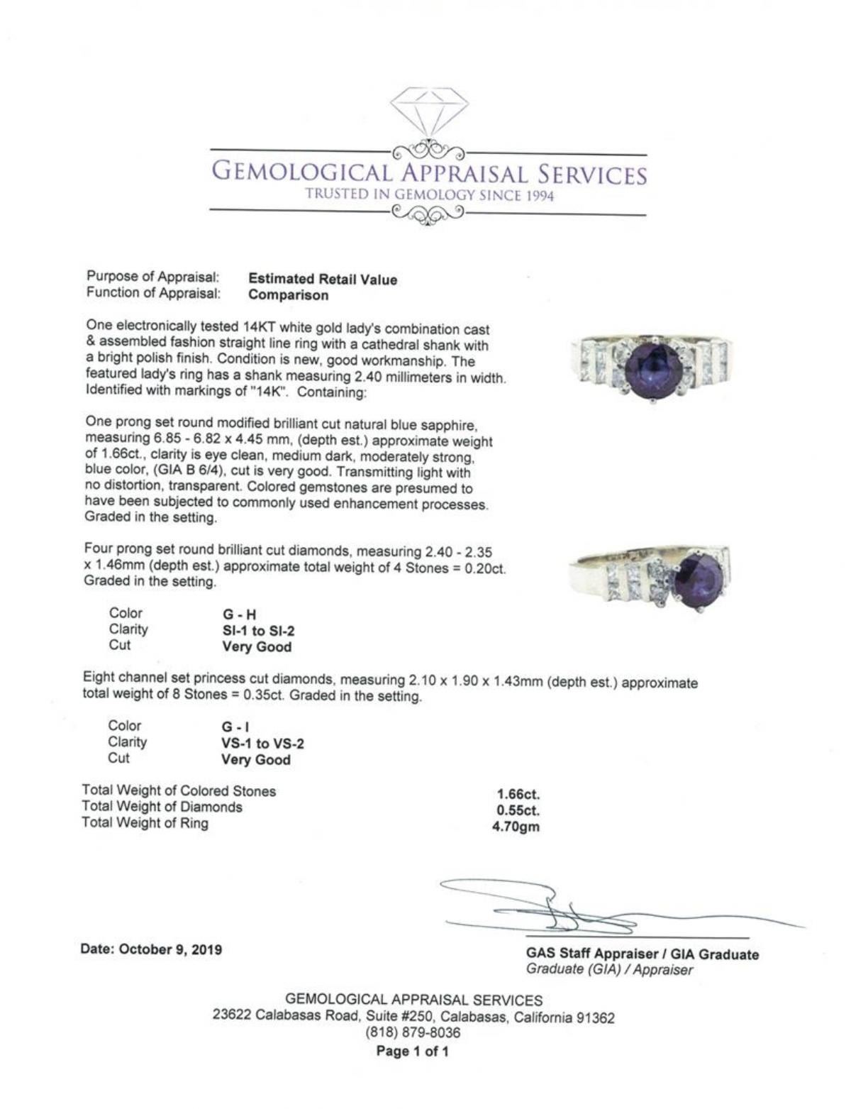 One electronically tested 14KT white gold lady's combination cast & assembled fashion straight line ring with a cathedral shank with a bright polish finish. The featured lady's ring has a shank measuring 2.40 millimeters in width. Identified with markings of '14K'. Condition is new, good workmanship. Containing: One prong set round modified brilliant cut natural blue sapphire, measuring 6.85 - 6.82 x 4.45 mm, (depth est.) approximate weight of 1.66ct., clarity is eye clean, medium dark, moderately strong, blue color, (GIA B 6/4), cut is very good. Transmitting light with no distortion, transparent. Colored gemstones are presumed to have been subjected to commonly used enhancement processes. Graded in the setting. Four prong set round brilliant cut diamonds, measuring 2.40 - 2.35 x 1.46mm (depth est.) approximate total weight of 4 Stones = 0.20 ct. Graded in the setting. Color G - H Clarity SI-1 to SI-2 Cut Very Good Eight channel set princess cut diamonds, measuring 2.10 x 1.90 x 1.43mm (depth est.) approximate total weight of 8 Stones = 0.35ct. Graded in the setting. Color G - I Clarity VS-1 to VS-2 Cut Very Good. Total Weight of Colored Stones 1.66ct.. Total Weight of Diamonds 0.55ct.. Total Weight of Ring 4.70gm GAS Appraised at $3450.00. GAS Appraised.