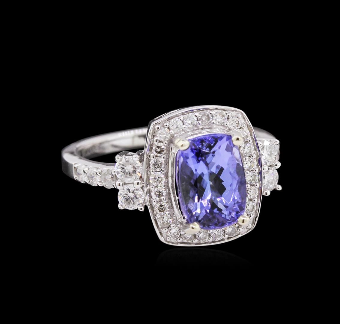 One electronically tested 14KT white gold ladies cast tanzanite and diamond ring with a bright polish finish. Trademark is ORIANNE. Identified with markings of "14K". Condition is new, good workmanship. Containing: One prong set rectangular cushion mixed cut natural tanzanite, measuring 8.50 x 6.00 x 5.00mm, 10%. bulge factor, approximate weight of 2.21ct., clarity is eye clean, type I, medium, very slightly grayish, violetish blue color, (GIA vB 5/3), cut is good. Transmitting light with no distortion, transparent. Graded in the setting. Tanzanite is a very rare gemstone that is only found in the country of Tanzania. Originally discovered in 1967. Tiffany & Company, named the stone Tanzanite. It is found in the Usumburu Mountains that border the Umba Valley of northern Tanzania. Tanzanite occurs in gray, brown, violet, blue, reddish-purple, & green. The gem is interesting because of its exceptional pleochroism. Rotated in different directions a tanzanite will exhibit multiple changes of color. Tanzanite has a low tolerance to ultrasonic cleaning, and should not be cleaned using this method. Thirty-Four prong set round brilliant cut diamonds, measuring 2.60 - 1.20 x 1.14mm (depth est.) approximate total weight of 34 Stones = 0.65ct. Graded in the setting. Clarity: SI-1 to I-1. Color: G - I. Total Weight of Colored Stones 2.21ct. Total Weight of Diamonds 0.65ct. AIG Appraised at $7,975.00.
